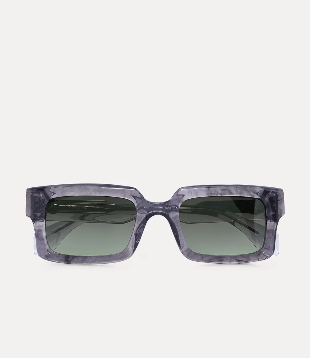 De Costello-zonnebril wordt gekenmerkt door een gedurfde en tijdloze esthetiek, geïnspireerd door de legendarische culturele figuren uit de theater- en filmwereld. Het ontwerp heeft een vierkant montuur met glazen met kleurverloop en is afgewerkt met grijs acetaat met marmereffect, versierd met gepolijste hoornaccenten op de buitenrand – een knipoog naar Vivienne’s iconische Horn Alice-band.