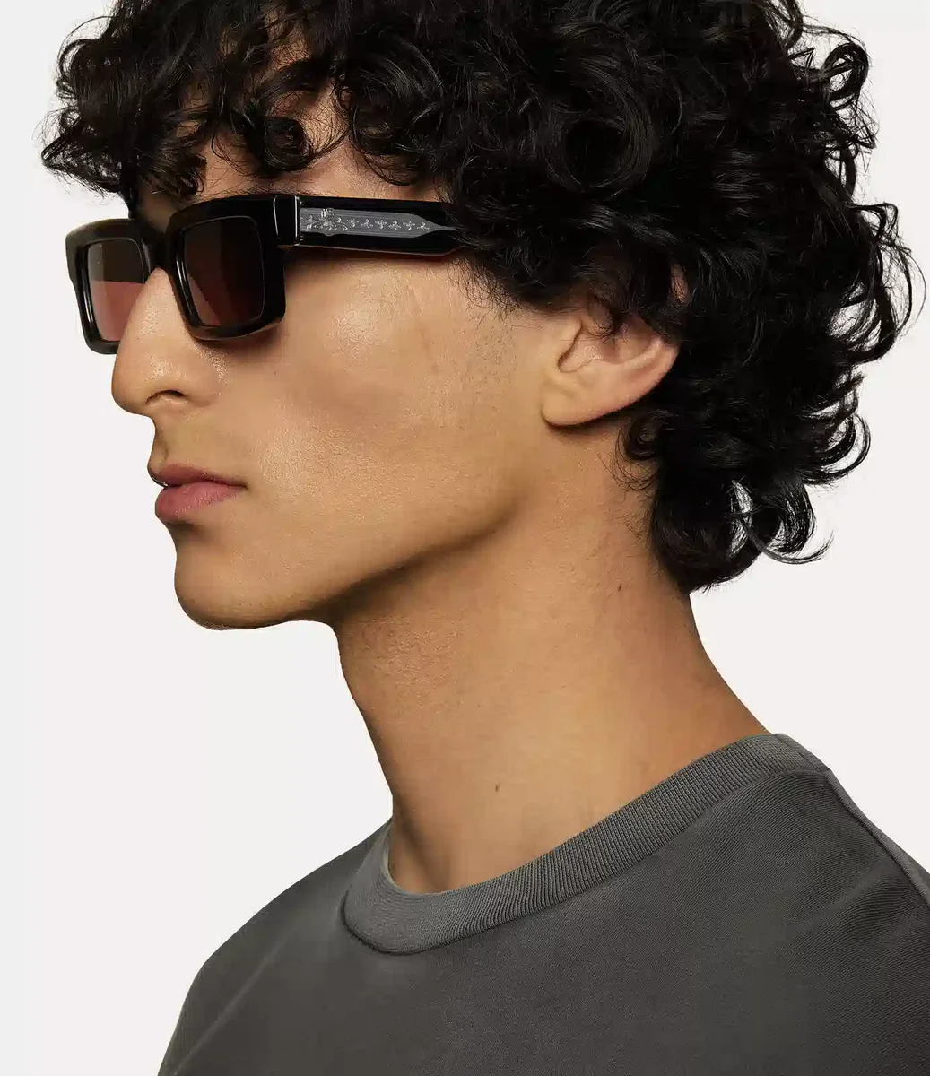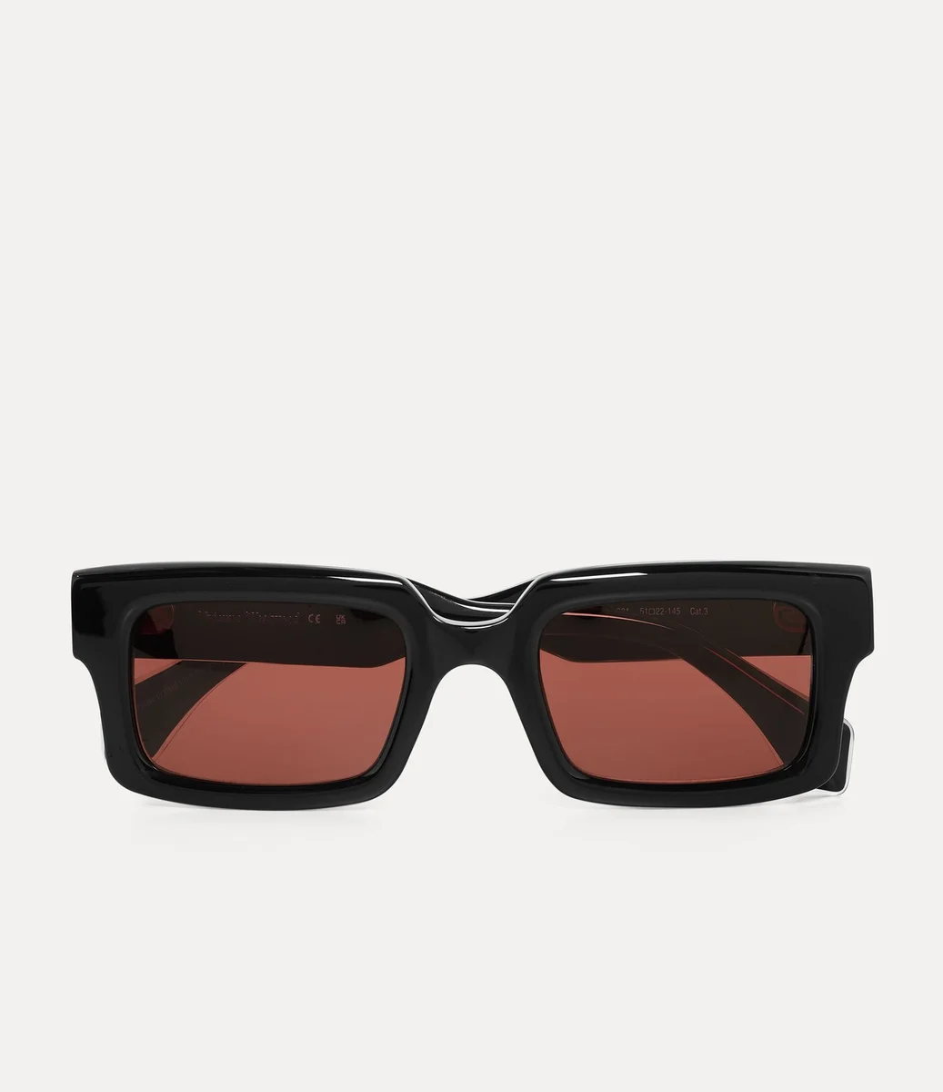 Het silhouet van de glanzende zwarte Costello-zonnebril is geïnspireerd op iconische culturele figuren uit de theater- en filmwereld. Het opvallende ontwerp met een dik, vierkant montuur en bruin getinte glazen wordt versterkt door gedetailleerde hoornaccenten aan de buitenrand, die doen denken aan Vivienne’s iconische Horn Alice-band. De gebeeldhouwde pootjes zijn versierd met bolmotieven bij de slapen, terwijl de op maat gemaakte metalen details zijn afgewerkt met miniatuurgravures van bollen.