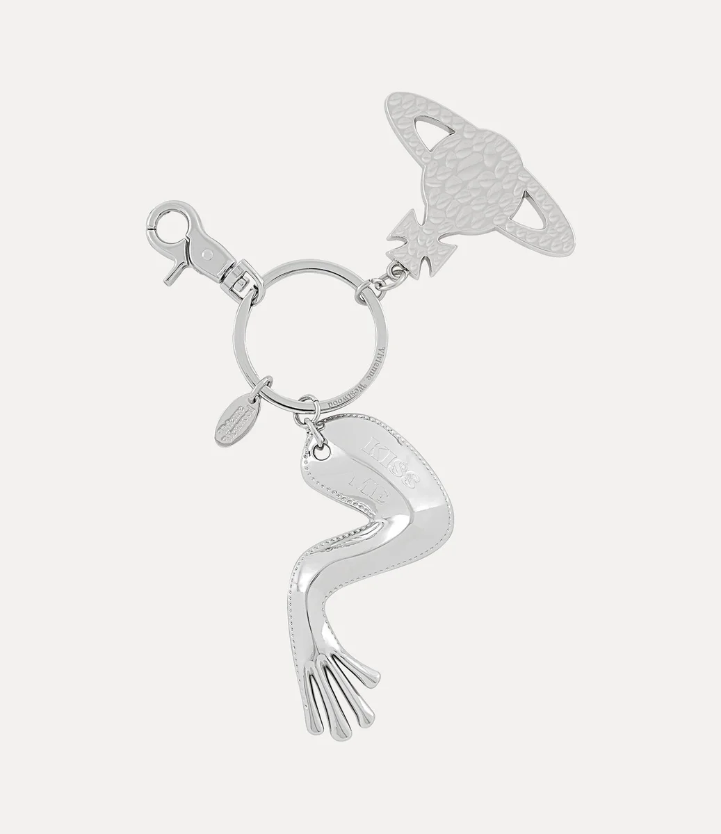 Onze Frog Leg Charm sleutelhanger, vervaardigd in gepolijst zilverkleurig metaal, is een speelse knipoog naar het sprookje ‘De kikker koning’. Het sierlijke silhouet van een kikkerpoot is geïnspireerd op antiek repoussé-decor en gegraveerd met de slogan ‘Kiss me’. Het is afgewerkt met het kenmerkende ‘gehamerde’ orb-motief van het huis.