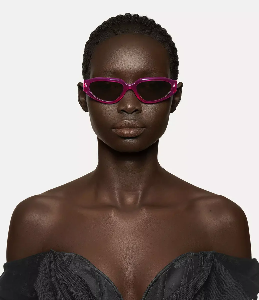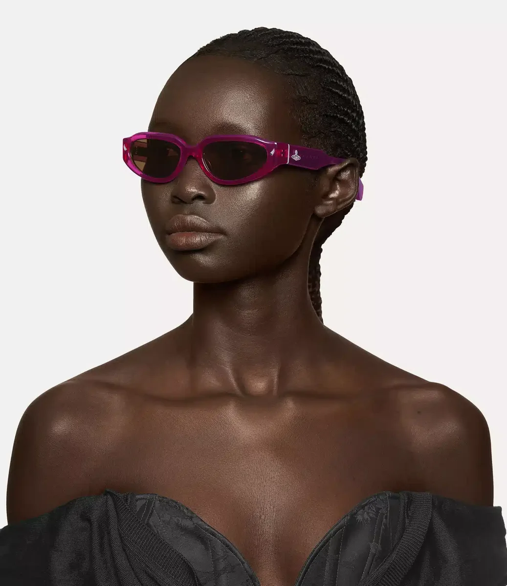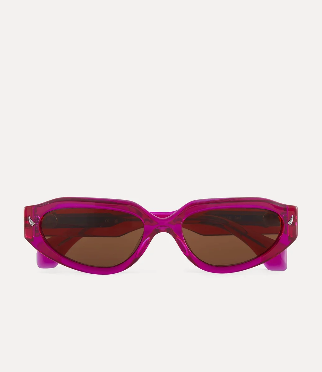 De Grace-zonnebril heeft een vintage-geïnspireerd ovaal silhouet met zacht uitlopende randen, die de glamour van Studio 54 uitstralen. De bril is gemaakt van semi-transparant roze acetaat met bruine glazen en wordt geaccentueerd door hoornvormige versieringen, die verwijzen naar Vivienne’s iconische Horn Alice-band.