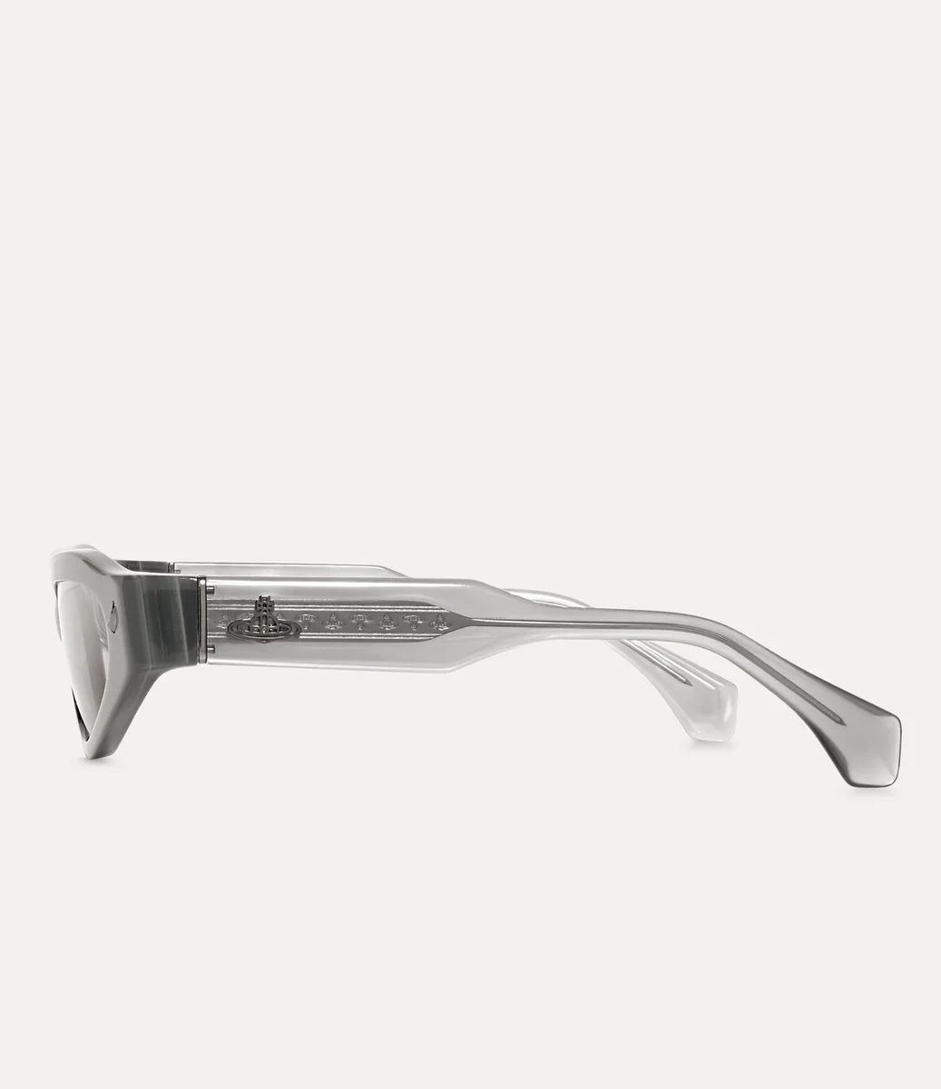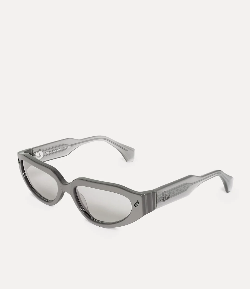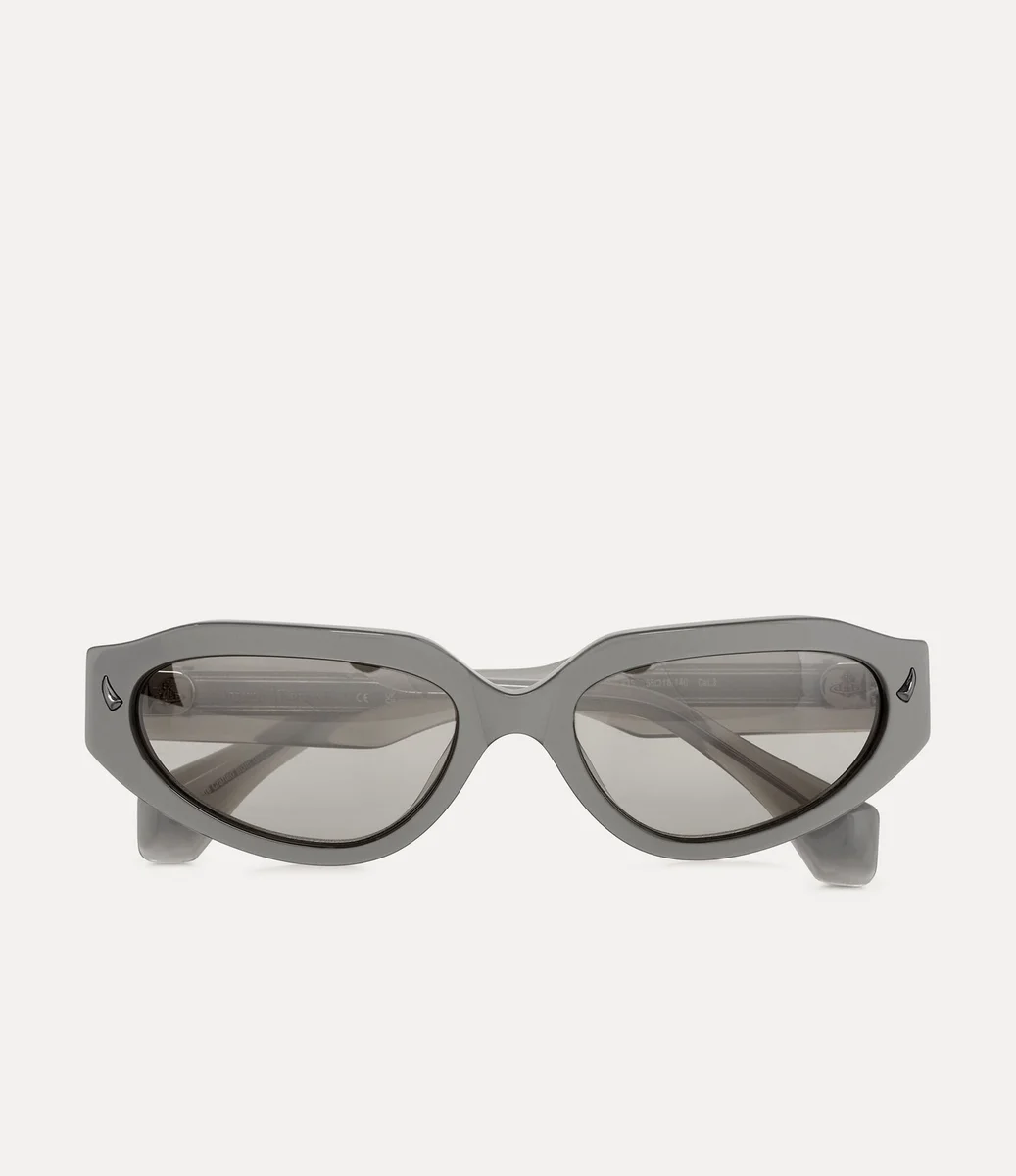 De Grace zonnebril heeft een vintage-geïnspireerd ovaal silhouet, gekenmerkt door een gedurfde, zacht uitlopende buitenrand, geïnspireerd op de glamour en tijdloze iconen van Studio 54. Het ontwerp is uitgevoerd in een glanzende zilveren afwerking en wordt verfraaid door getinte ton-sur-ton glazen en hoornvormige versieringen aan de buitenrand – een eerbetoon aan Vivienne’s iconische Horn Alice-band.