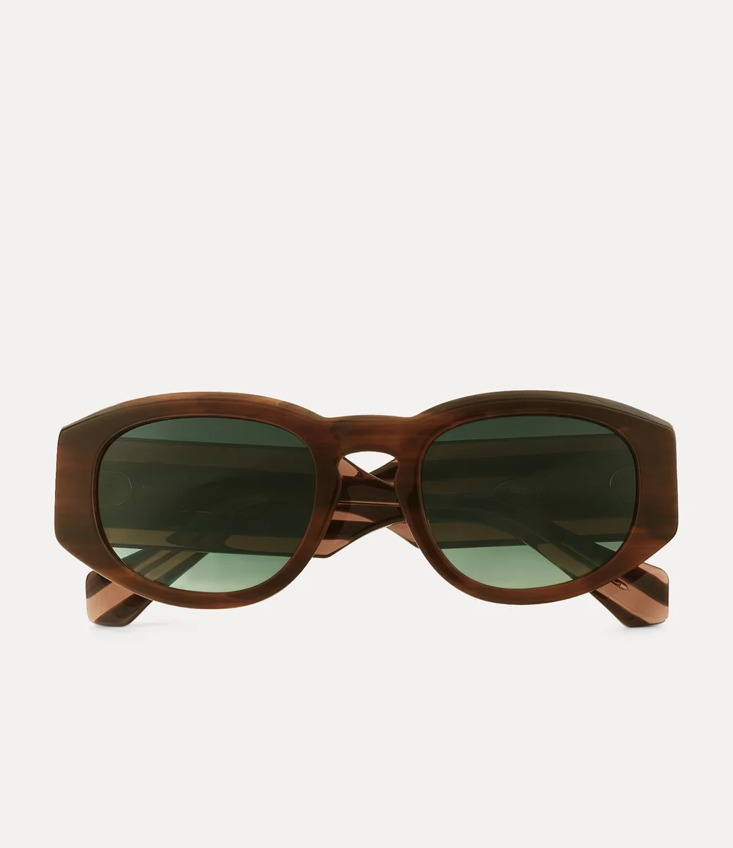 De Reed zonnebril heeft een vintage-geïnspireerd ovaal montuur met gladde hoorn-effect randen, geïnspireerd door de fotografie uit de jaren 50-60 en underground iconen uit de jaren 80. Het montuur is voorzien van gradiënt UV-beschermende glazen en afgewerkt met een tweedimensionale metalen bol op de pootjes, wat Vivienne’s visie weerspiegelt om het verleden mee te nemen naar de toekomst.