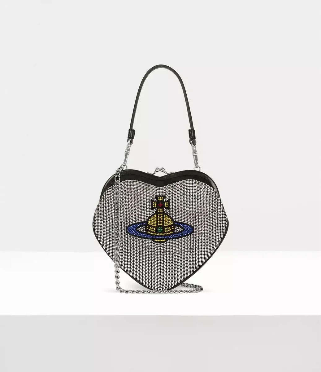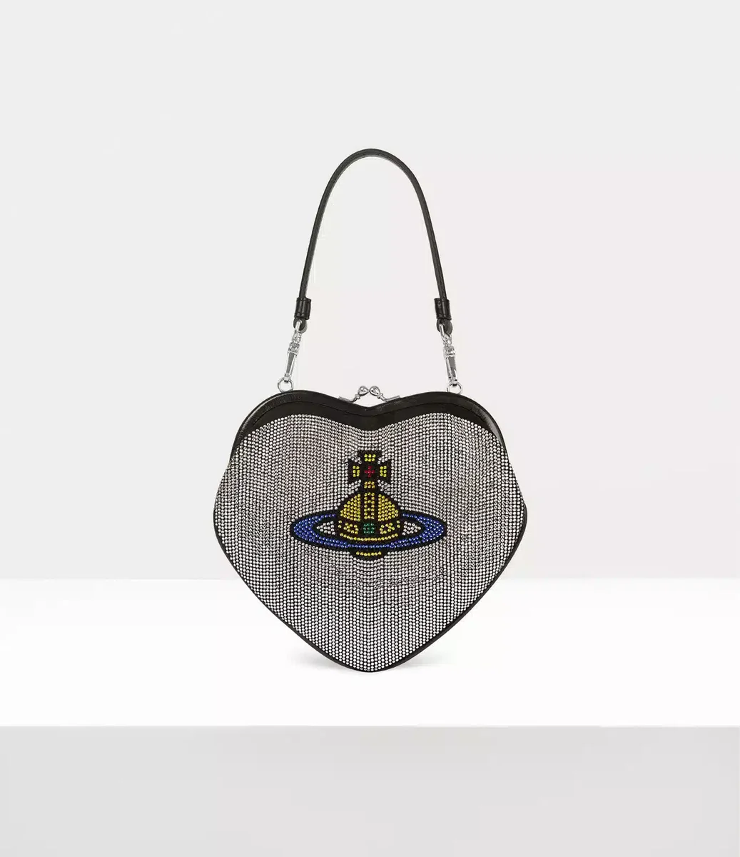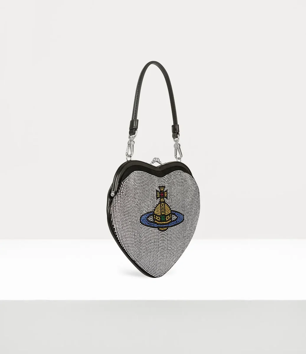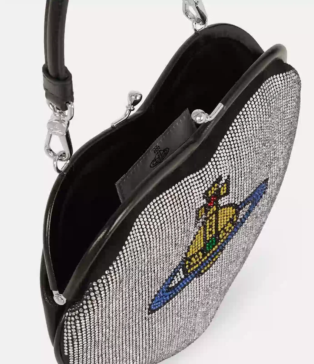 De Belle Heart Frame-tas heeft een hartvormig silhouet, een knipoog naar Vivienne’s liefde voor de mensheid en de planeet, compleet met gepolijste leren randen en onze kenmerkende zilverkleurige hardware. Het ontwerp is versierd met rijen glinsterende diamantsteentjes en straalt de weelde van het interieur van een grand hotel uit.