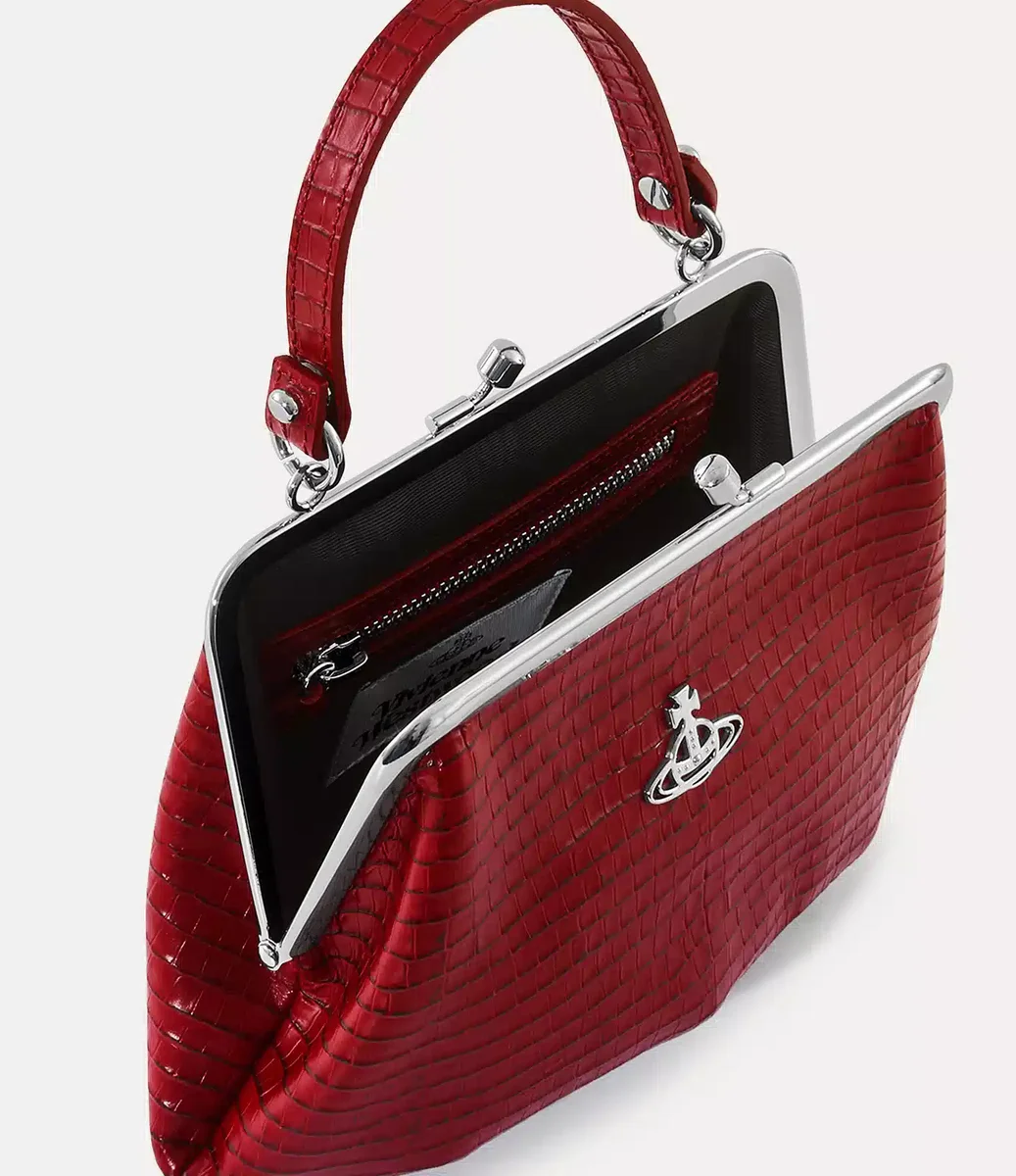 Onze Granny Frame-tas is geïnspireerd op de populaire antieke portemonnees uit het begin van de 20e eeuw en heeft een gepolijste kiss-lock sluiting en een zichtbaar metalen frame. Het item heeft de ‘Mini’-afwerking met krokodillenprint van dit seizoen, compleet met klassieke hardware-details.