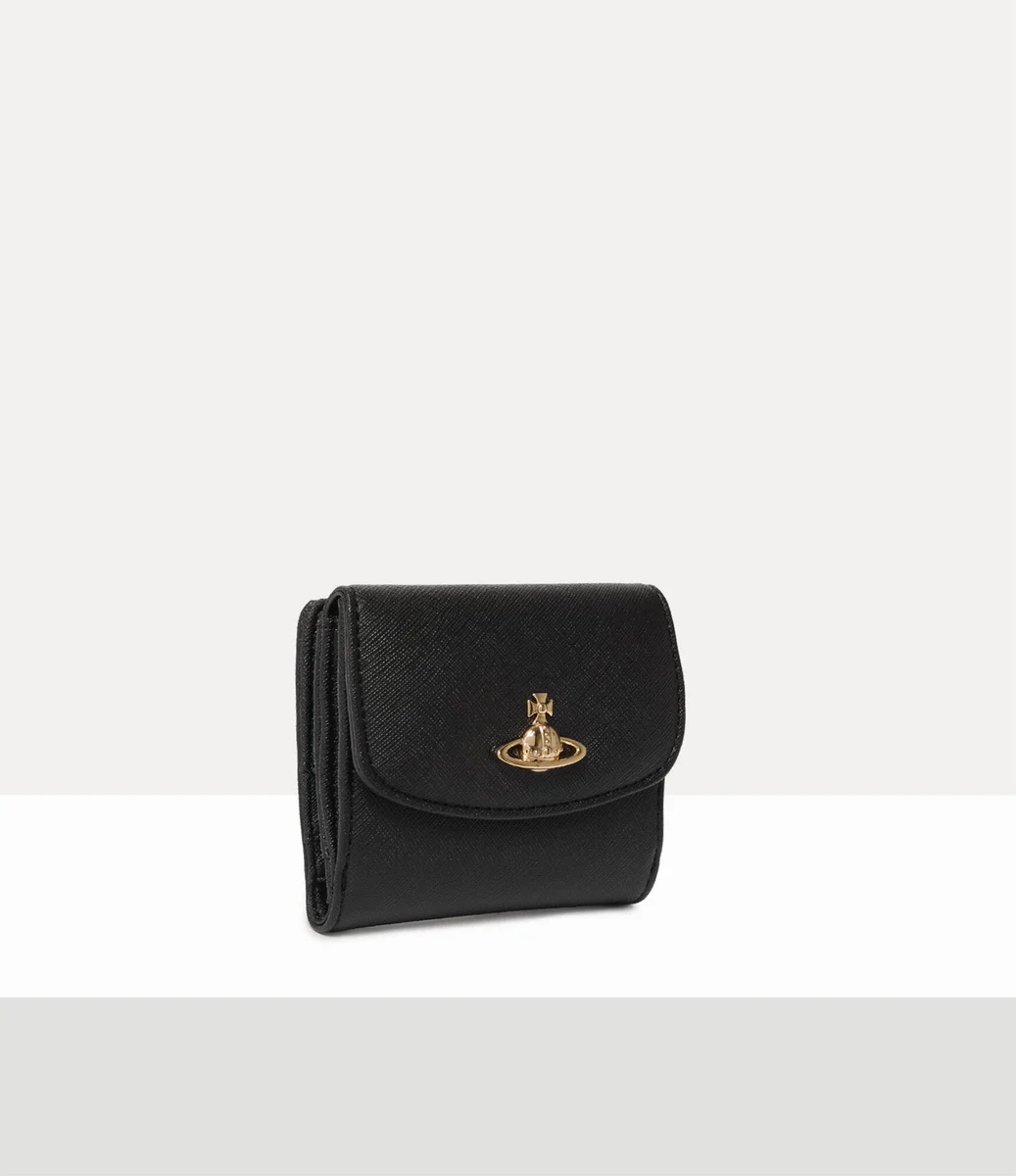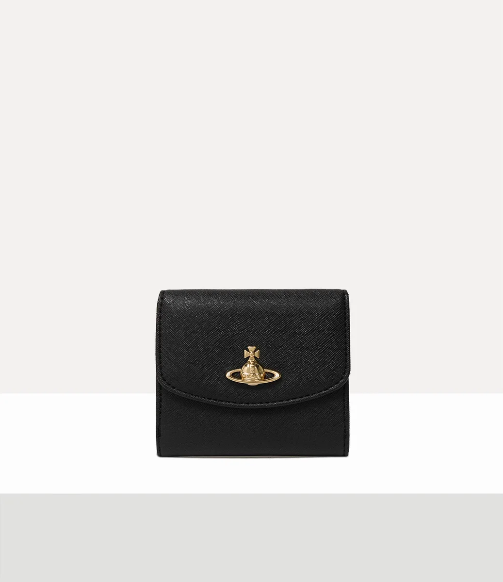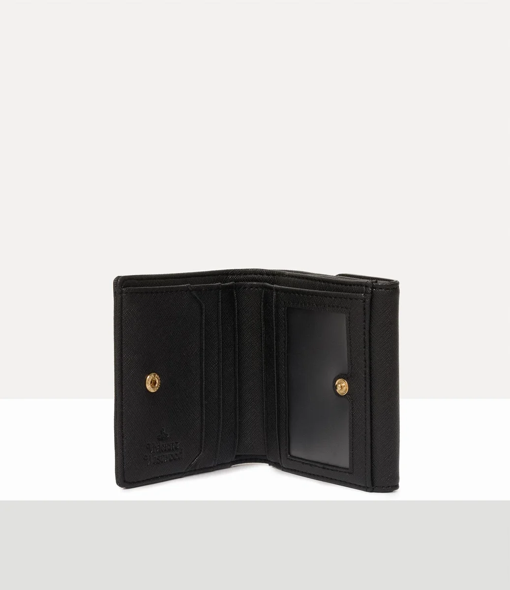 Onze kleine portemonnee heeft een strak ontwerp met twee vouwen, is gemaakt van PU-leer en onderscheidt zich door zijn gekruiste saffiano-textuur. Het iconische orb-logo van het huis in goudkleurig metaal siert de voorklep, boven een gepolijste drukknoopsluiting, terwijl subtiele reliëfbranding het binnenpaneel verrijkt.