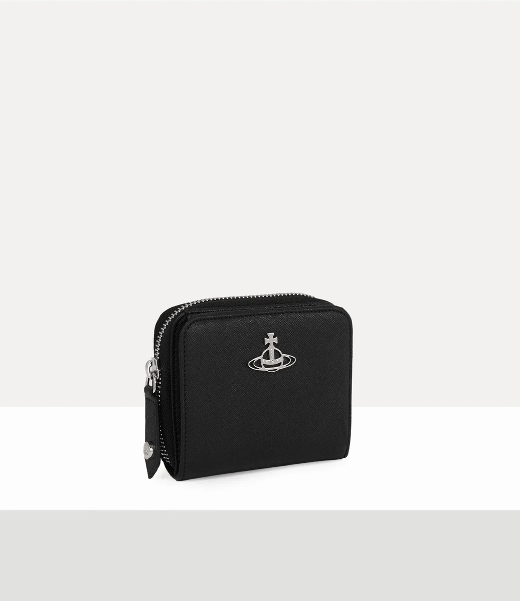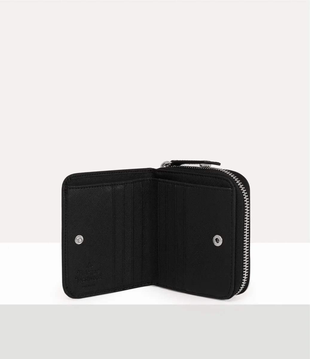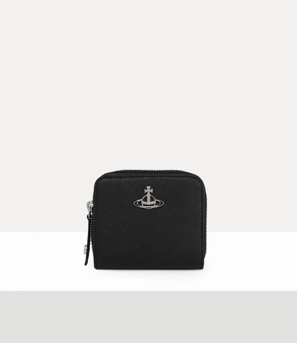 Onze middelgrote portemonnee met ritssluiting, gemaakt van PU-leer met saffiano-reliëf, heeft een overzichtelijke binnenkant met geïntegreerde kaartsleuven en een speciaal vak voor bonnetjes en briefgeld. Het item heeft een afgeronde vorm en sluit met een veilige ritssluiting, compleet met een driedimensionaal orb-embleem aan de voorkant.