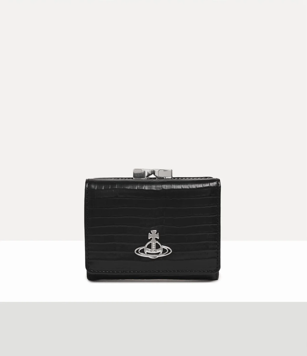 Onze Small Frame-portemonnee is gemaakt van leer en voorzien van het mini-krokodillenleer-effect dat dit seizoen populair is. Het ontwerp heeft een overzichtelijke binnenkant en een speciaal vak voor muntgeld, en sluit veilig met onze kenmerkende zilverkleurige sluiting.