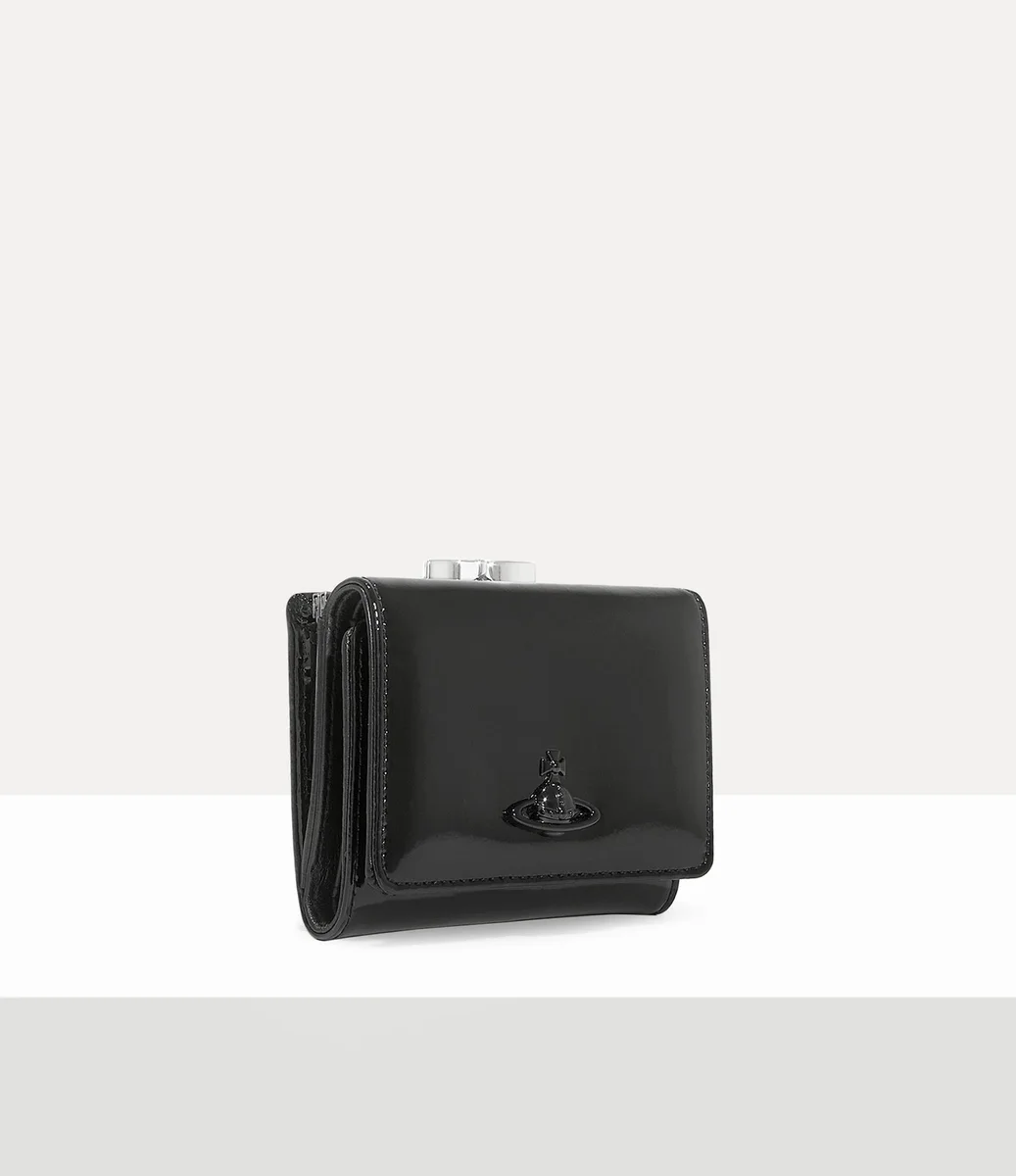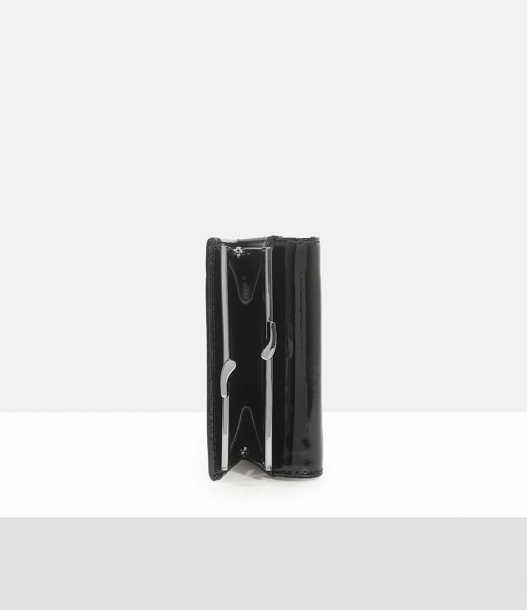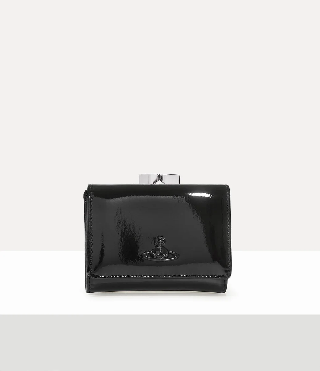 Onze Small Frame-portemonnee heeft een driemaal gevouwen leren silhouet, versierd met een ton-sur-ton bas-reliëf orb-plaatje dat Vivienne’s visie om traditie naar de toekomst te brengen belichaamt. De lakafwerking, die doet denken aan de vloeibare latex en rubberen kleding in onze iconische Sex-boetiek, roept de kenmerkende punkesthetiek van ons huis op.
