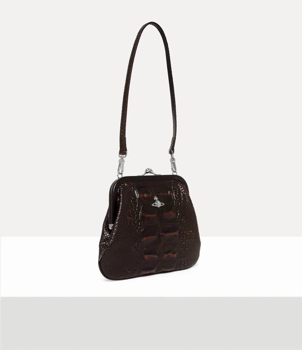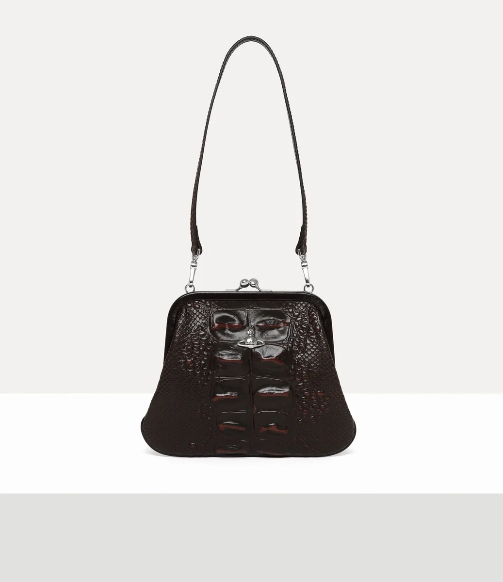 Onze Vivienne’s clutch, vervaardigd uit leer, is voorzien van het reliëfmotief ‘Dinosaur’ van dit seizoen, dat doet denken aan de textuur van de huid van prehistorische reptielen. Het item is vernoemd naar Vivienne, die dol was op deze stijl, en is versierd met ons kenmerkende ‘Line Orb’-motief op het voorpaneel.