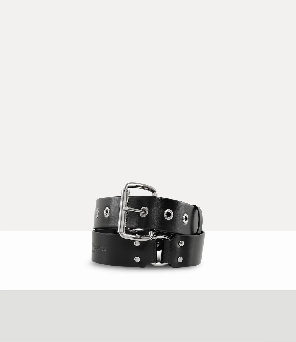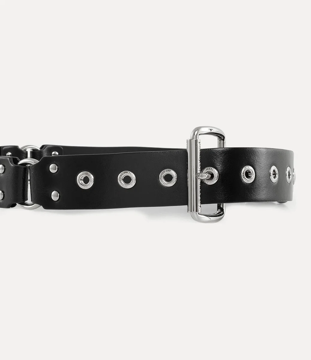 Deze riem is geïnspireerd op de ‘Erotic Zones’-collectie van Vivienne Westwood voor lente-zomer 1995 en is versierd met opvallende, op bondage geïnspireerde ringen en opvallende metalen hardware. Een gepolijste rolgesp maakt het ontwerp compleet, terwijl gegraveerde letters de oogjes versieren.