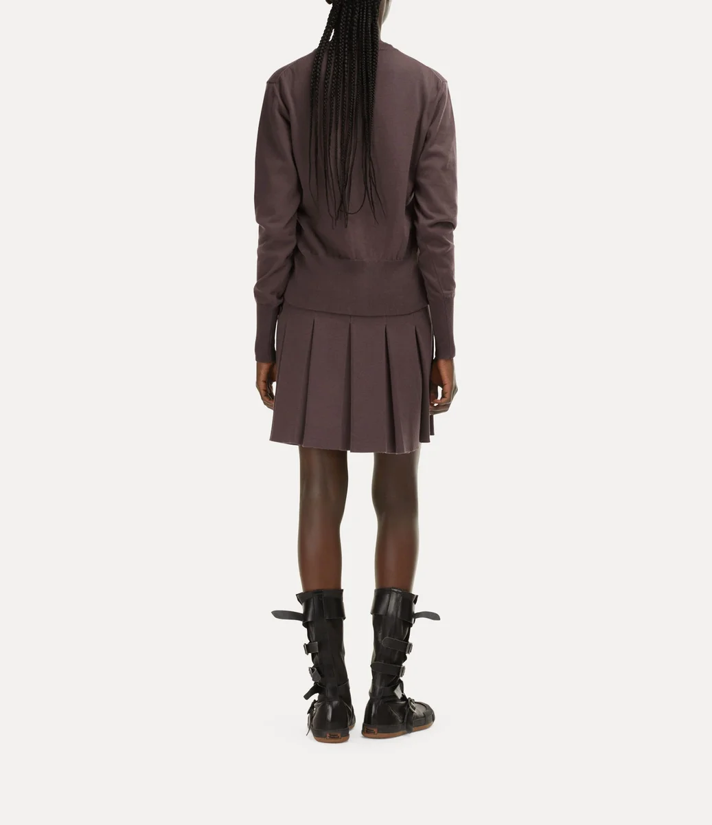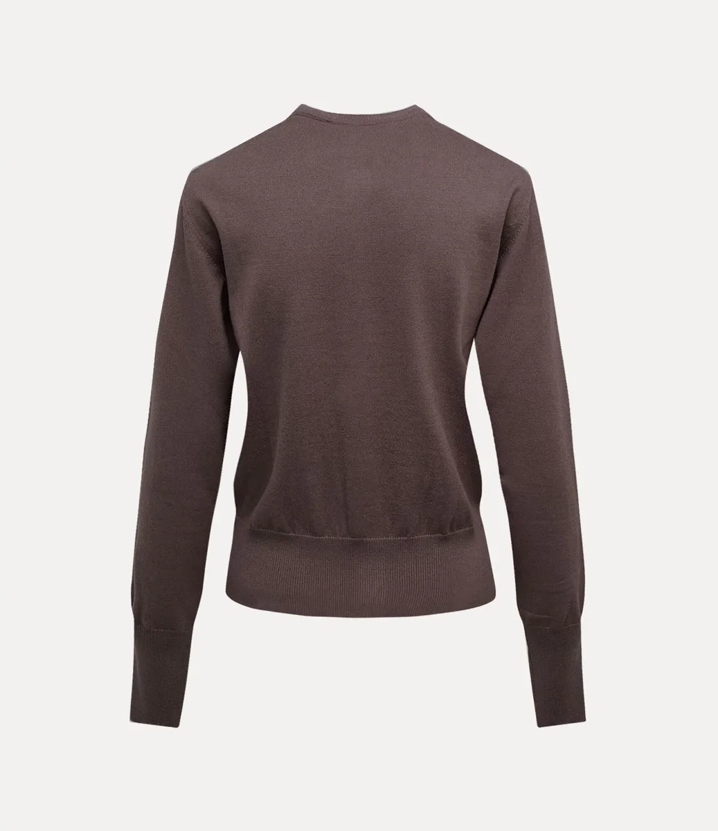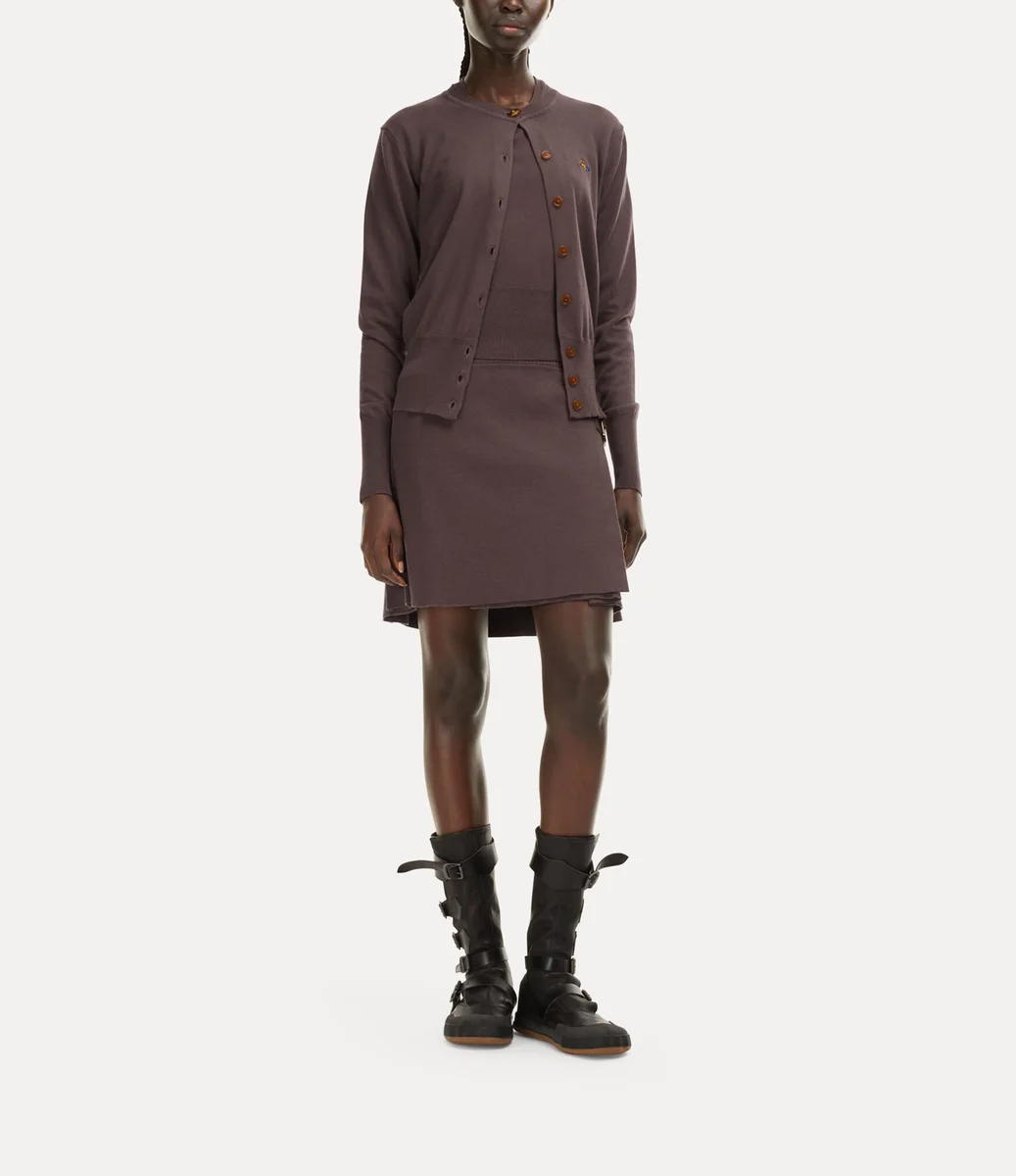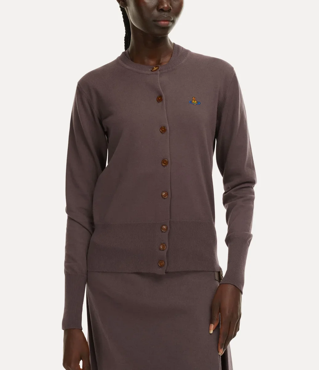 Ons Bea-vest heeft een katoen-kasjmier afwerking, een ronde halslijn en een getailleerd silhouet. Het kledingstuk is versierd met onze kenmerkende amberkleurige knopen en een geborduurde bol op de borst, die symbool staat voor Vivienne’s visie om traditie naar de toekomst te brengen.