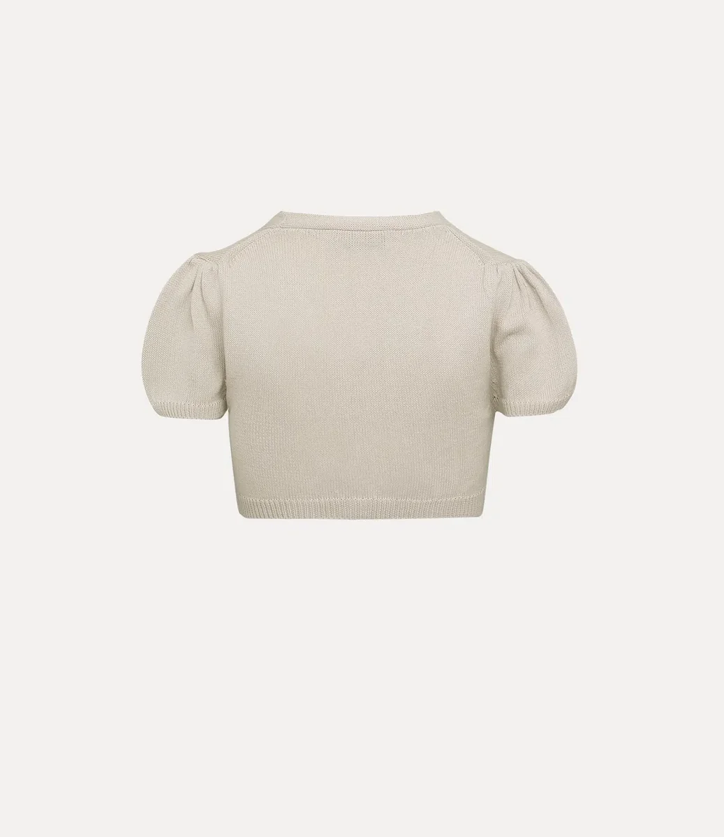 Ons Ida-vest is gemaakt van een zachte katoen-kasjmiermix en afgewerkt met de kenmerkende amberkleurige knoopsluiting van het huis. Het ontwerp heeft een diepe V-halslijn, licht gepofte mouwen en geribde boorden, en valt in een subtiel cropped silhouet.
