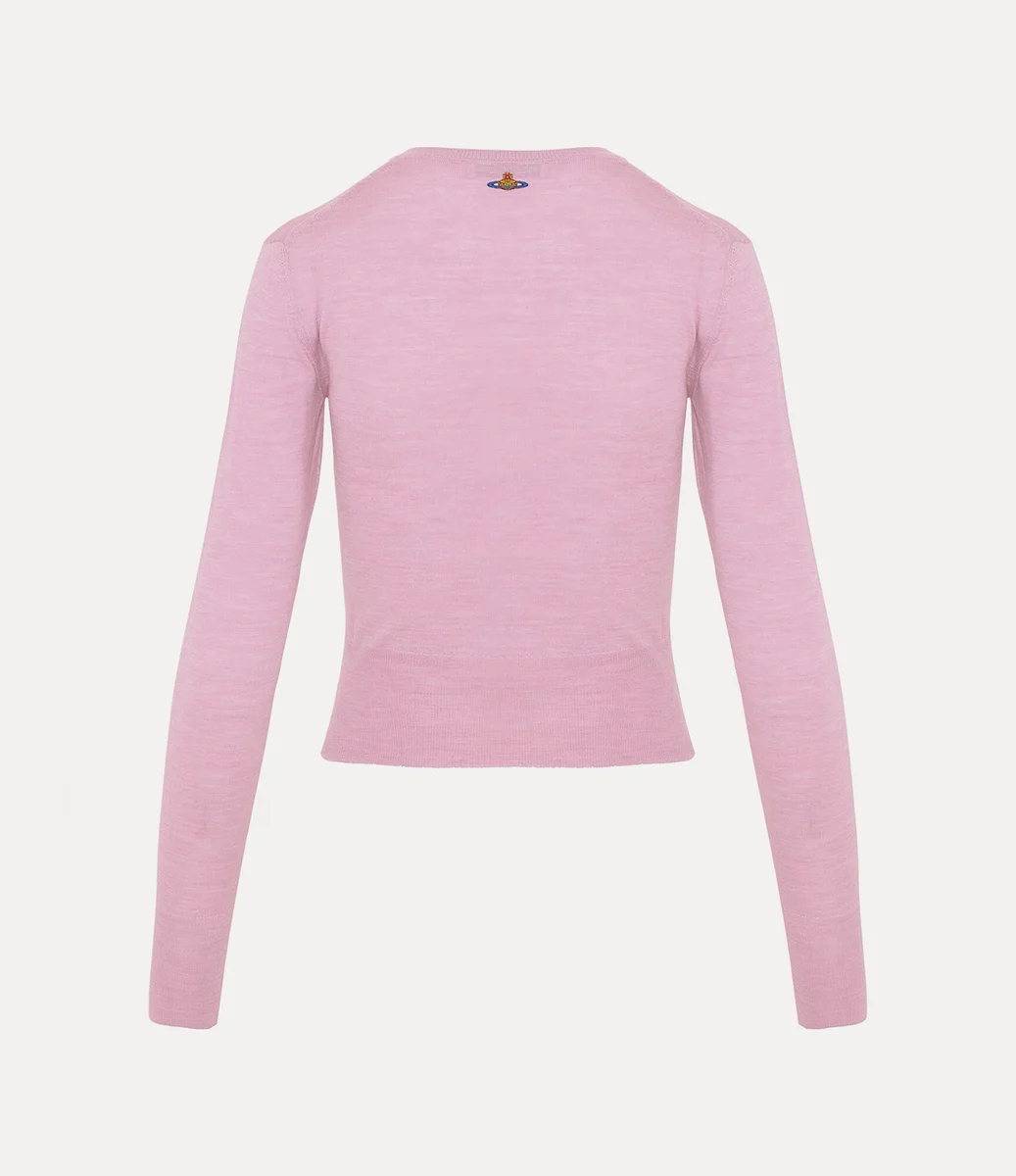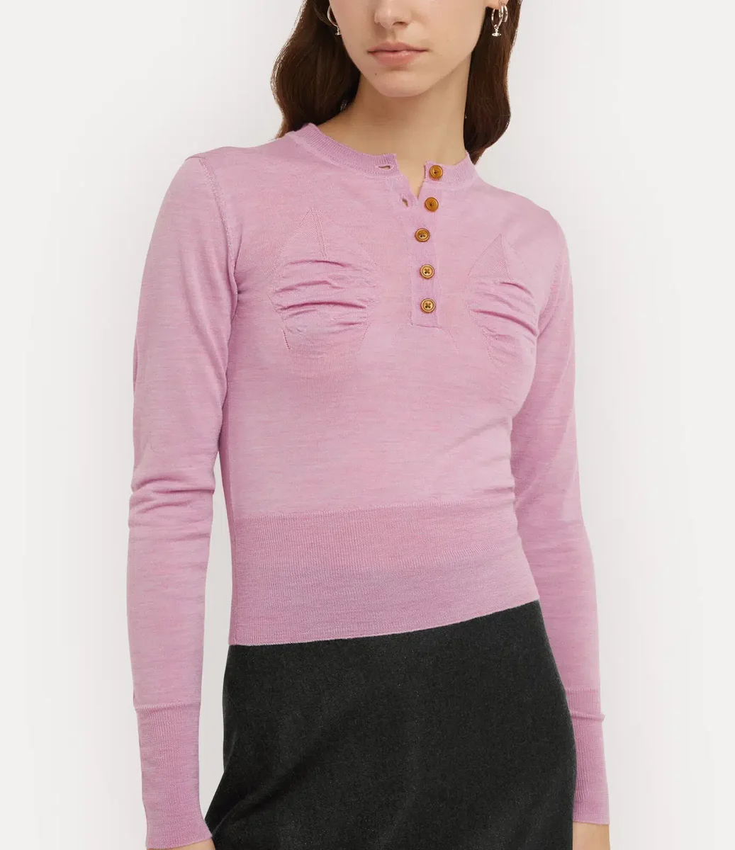 Onze Tit-trui heeft sculpturale stiksels die de contouren van de borst benadrukken, in navolging van de avant-gardistische silhouetten van Vivienne’s herfst-wintercollectie ‘Vive la Cocotte’ uit 1995. Het kledingstuk is verfraaid met geribde boorden en versierd met een geborduurde bol op de rug.