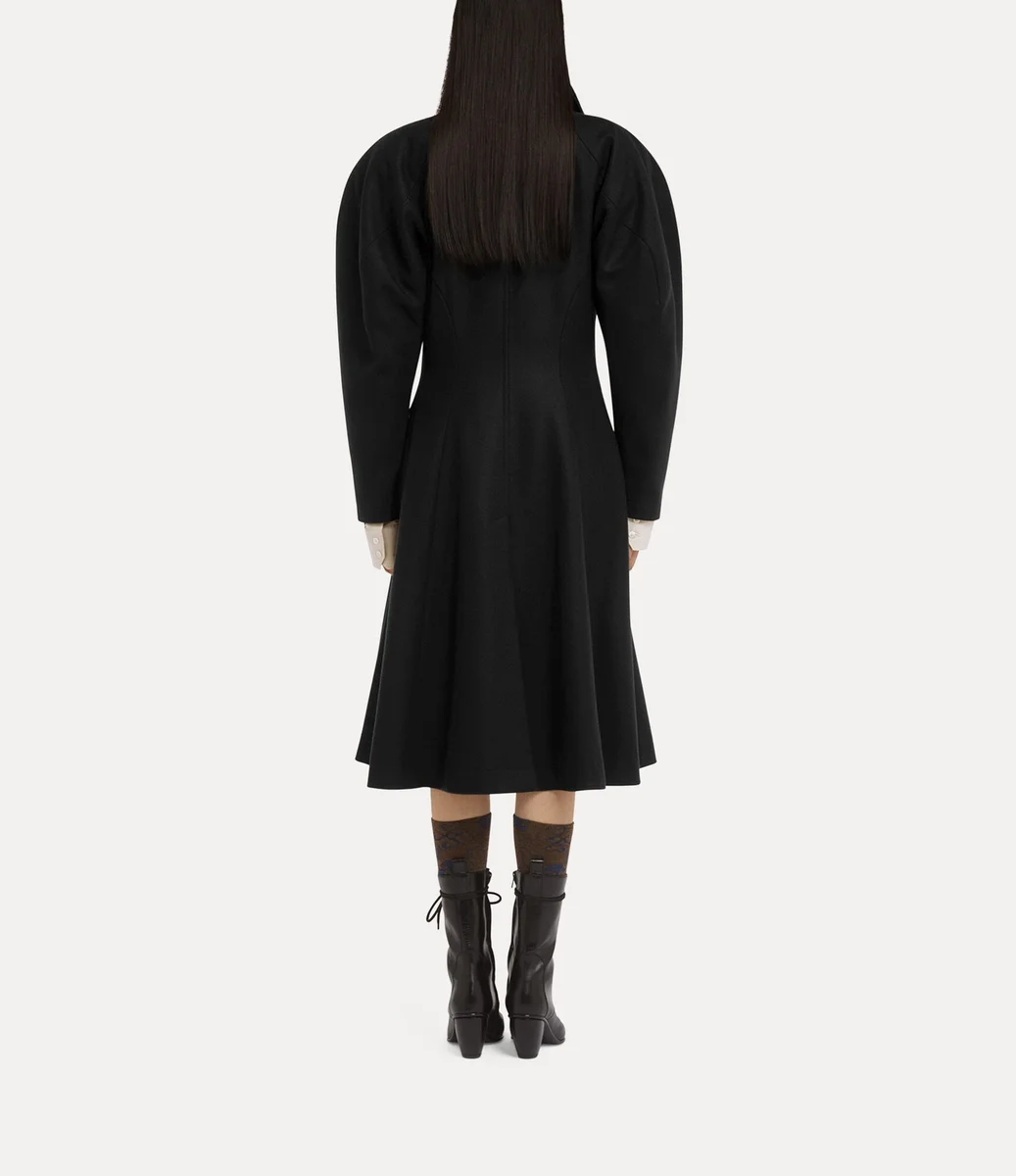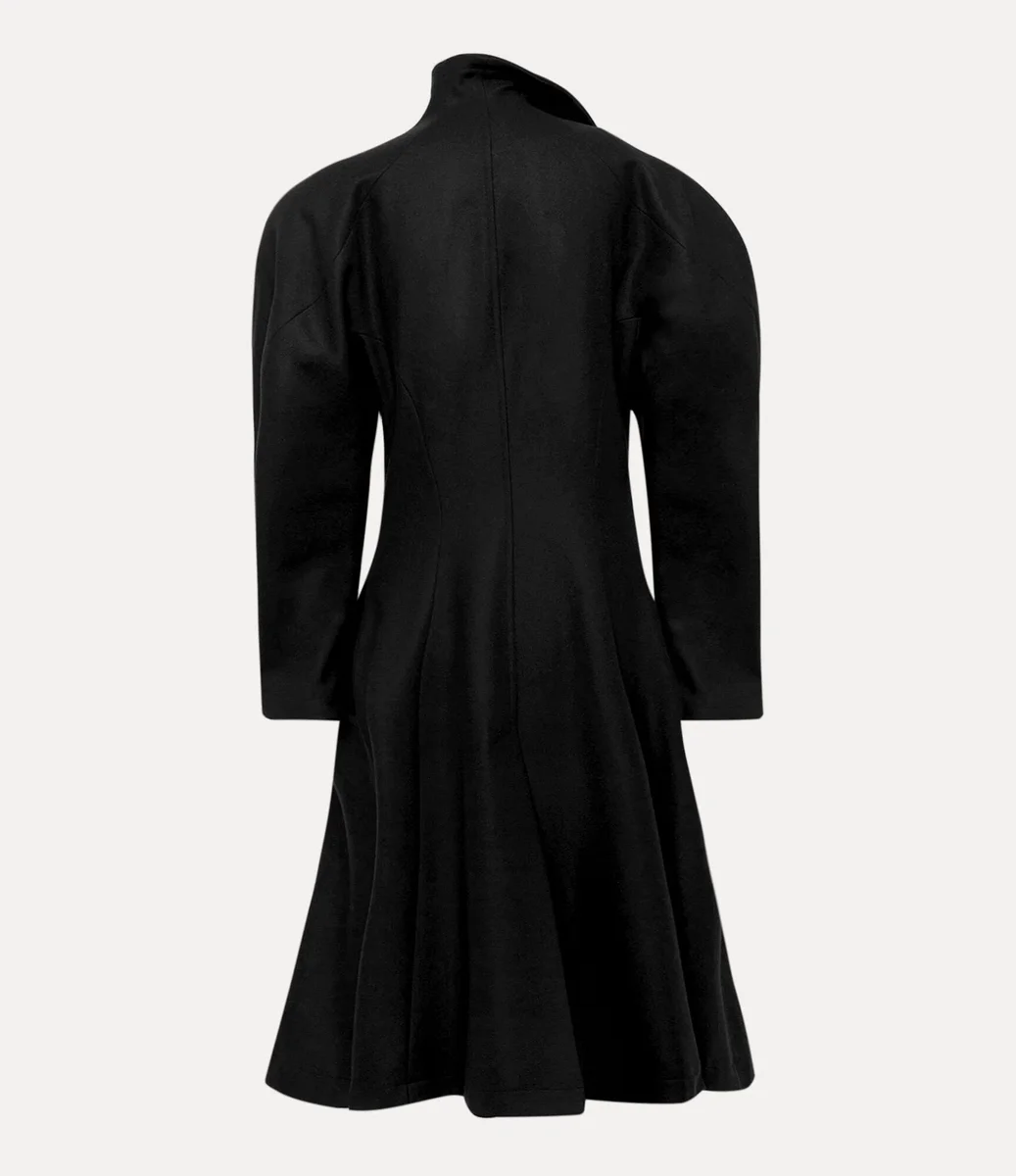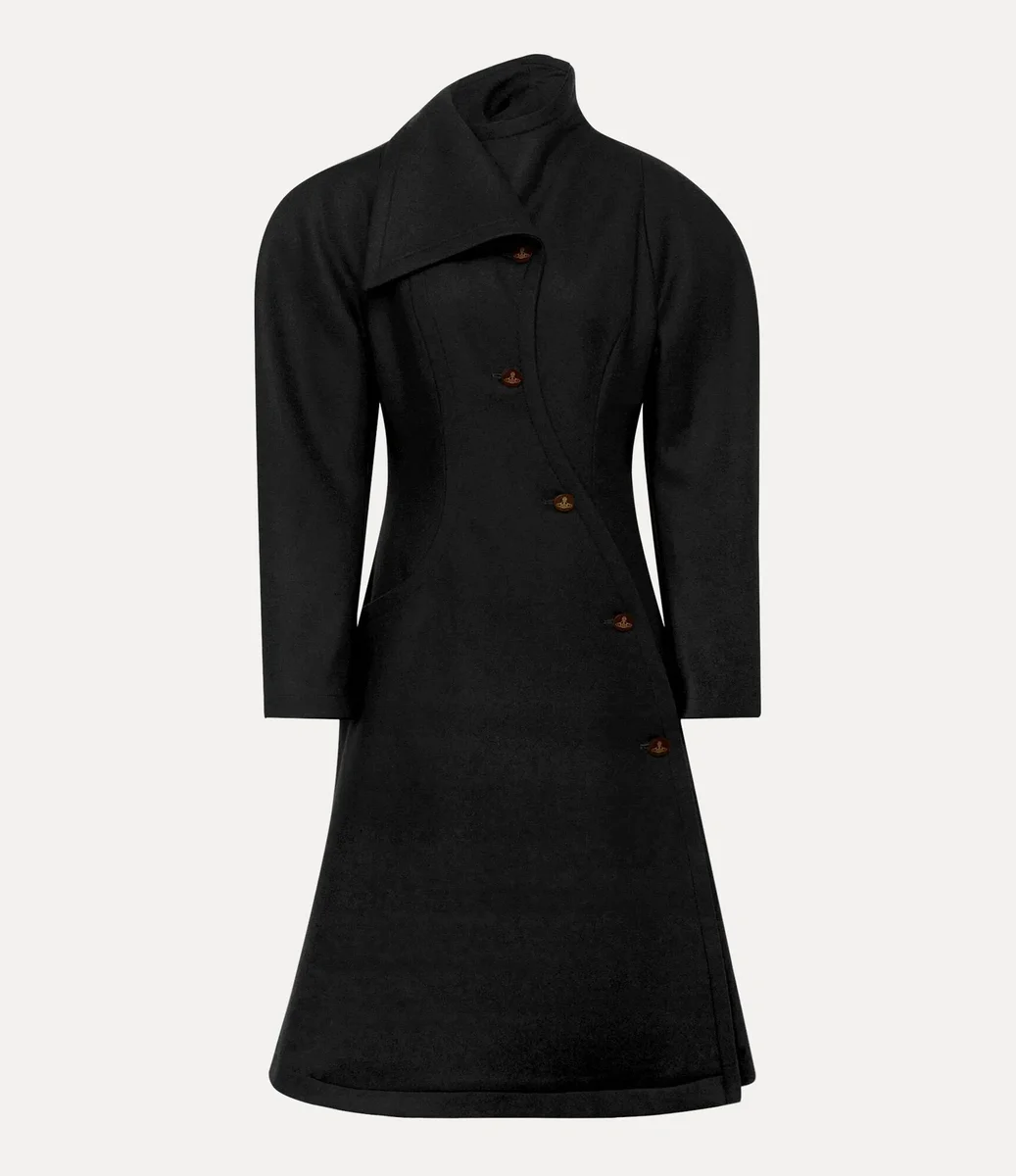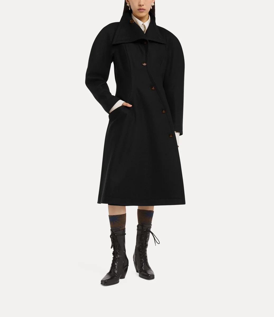De Breeze-jas heeft een asymmetrische single-breasted voorkant, die wordt gesloten met ovale knopen met het delicate ‘Line Orb’-motief erin gegraveerd – een knipoog naar Vivienne’s visie om traditie en toekomst te combineren. De jas is gemaakt van een wol-kasjmiermix en heeft overdreven ronde schouders, een scherp getailleerde taille en een uitlopende zoom, waardoor een getailleerd silhouet ontstaat.