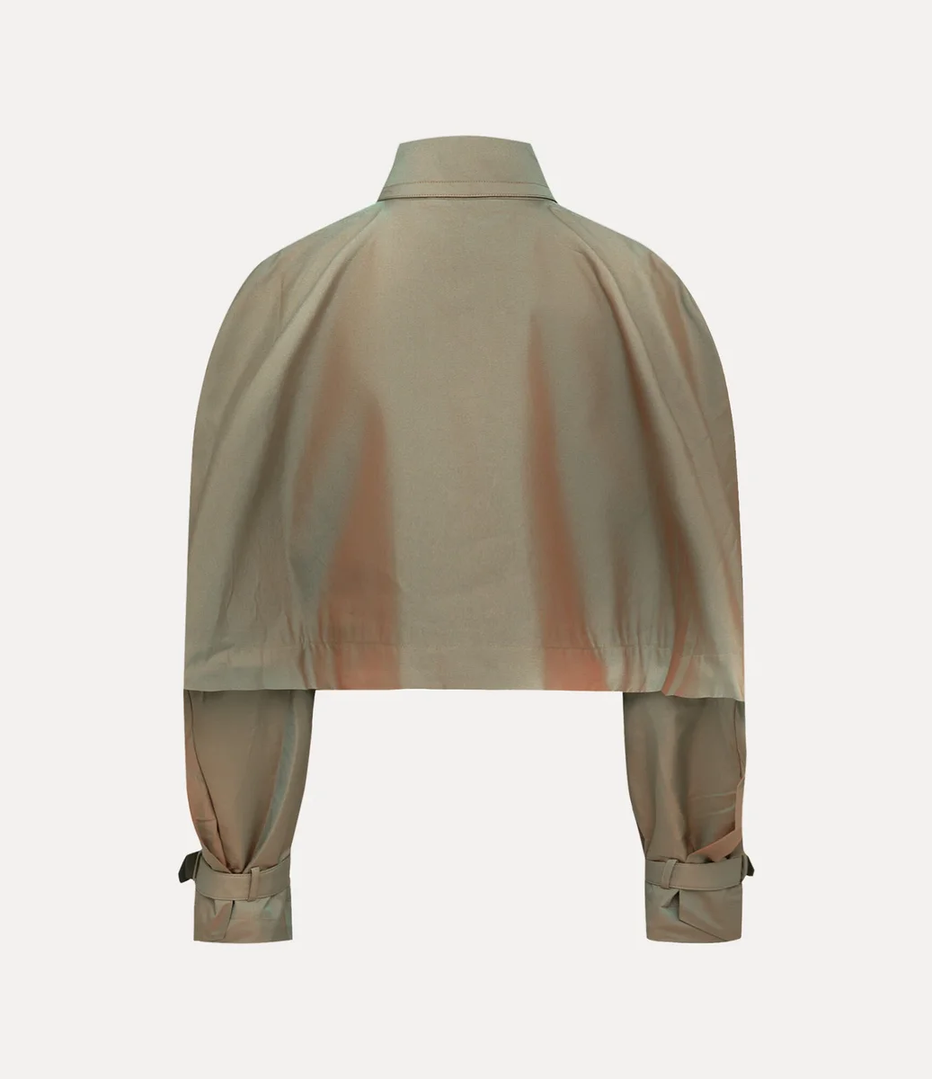 Onze Cut Off Graziano trenchcoat is opnieuw ontworpen in een tweekleurige afwerking, compleet met een zachte groenbruine wassing die een verweerd, iriserend effect geeft. Het ontwerp heeft een volumineus silhouet en is geïnspireerd op het archiefsysteem ‘Cloud’, dat voor het eerst werd geïntroduceerd in de herfst-wintercollectie 2022 van Andreas Kronthaler voor Vivienne Westwood.
