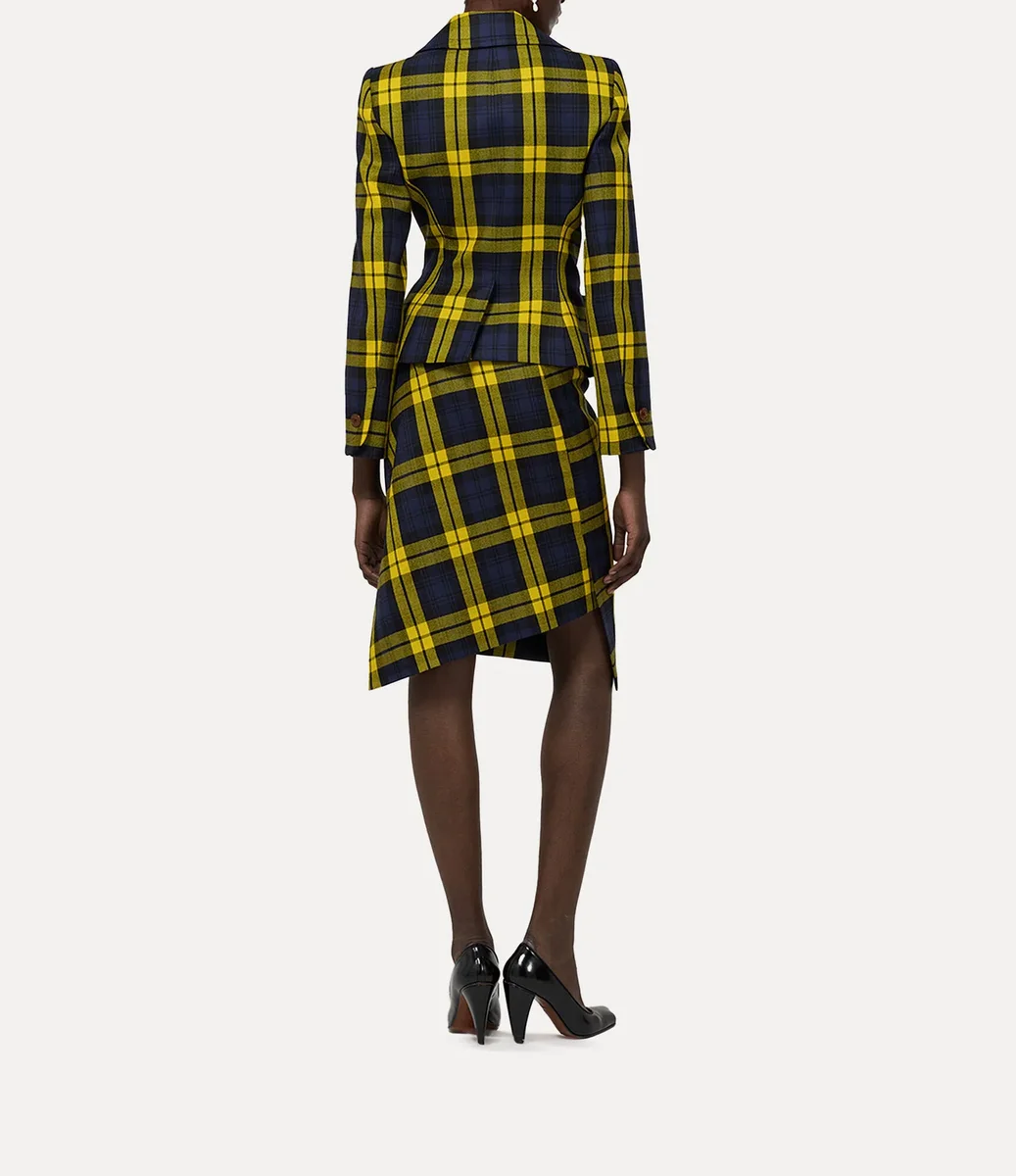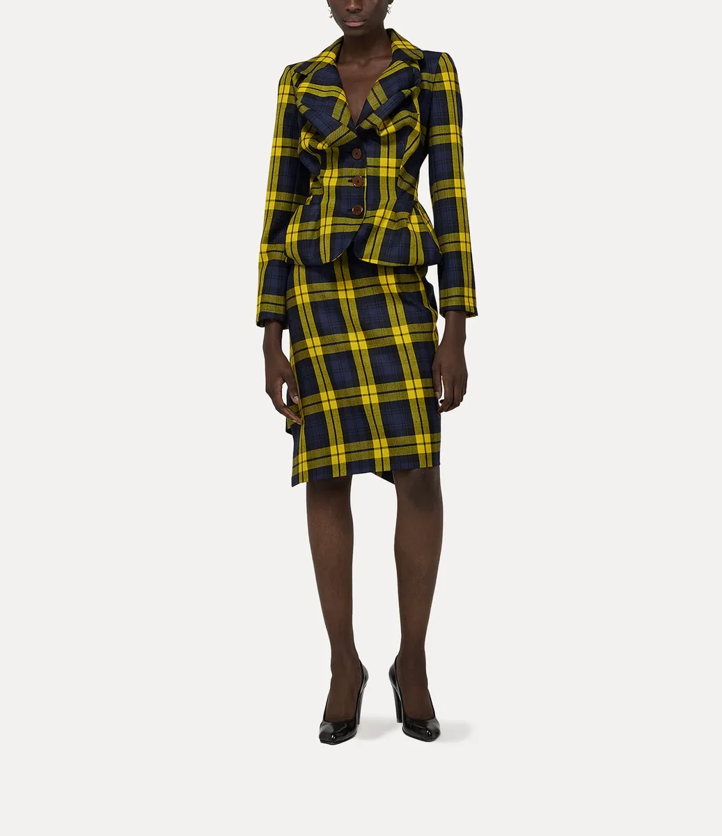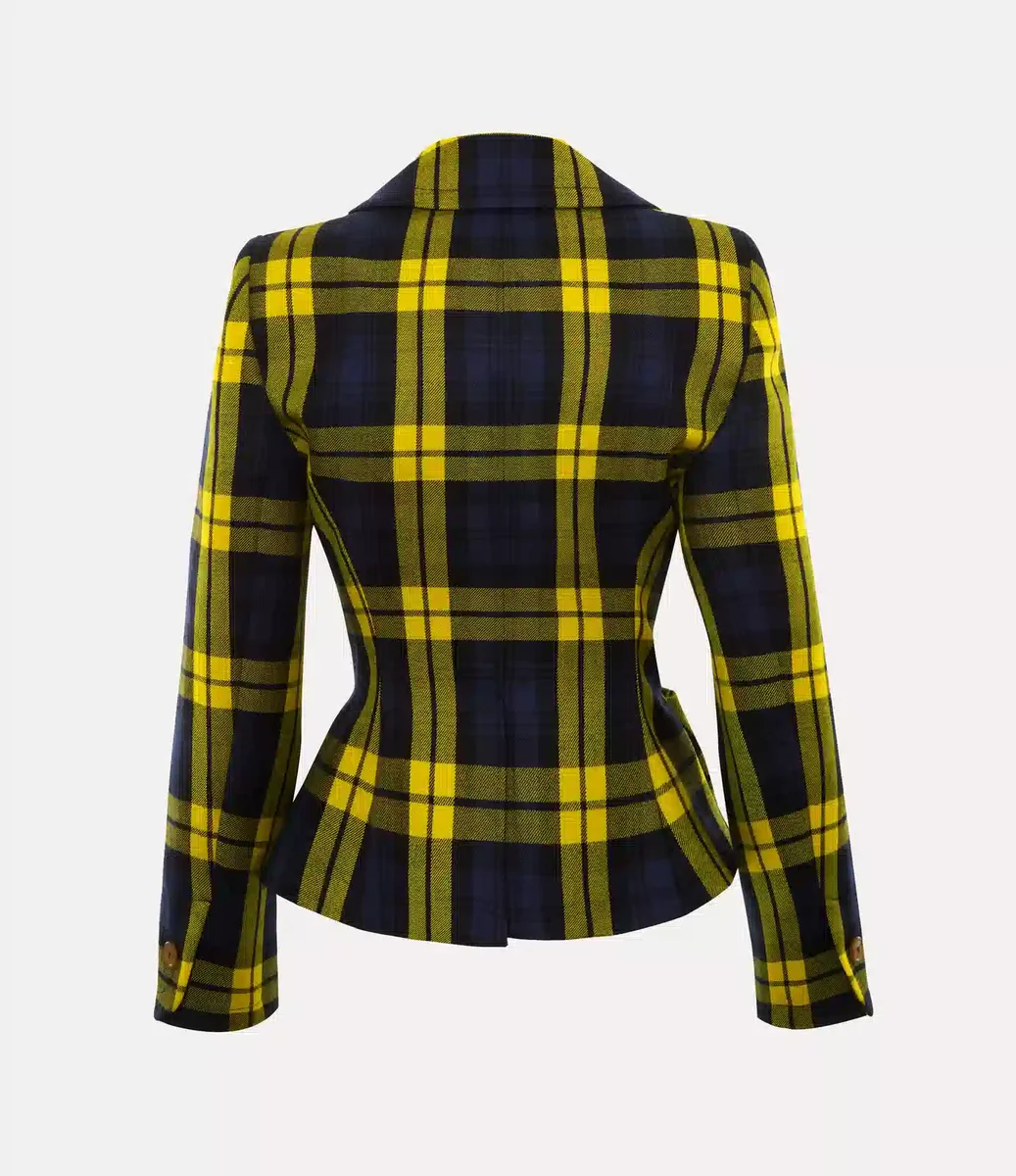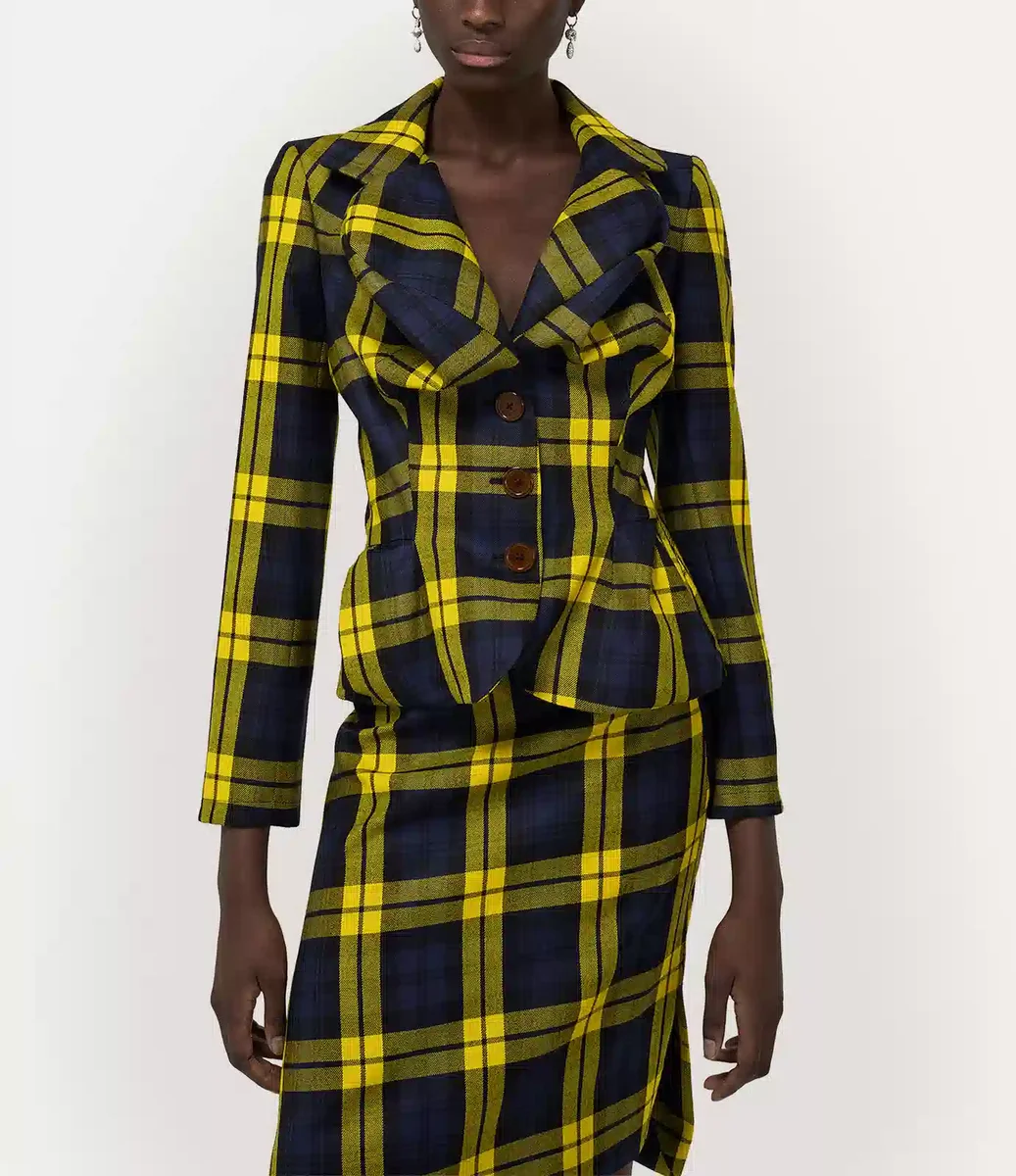 Het Drunken-jasje maakt gebruik van Vivienne’s originele experimentele ‘drunken tailoring’-patroonsysteem, waarbij kledingstukken worden vervormd tot een bijna surrealistische vorm. Het kledingstuk is uitgevoerd in de wollen ‘Moonshine’-ruit van dit seizoen, met levendige kleuren en een knoopsluiting aan de voorkant.