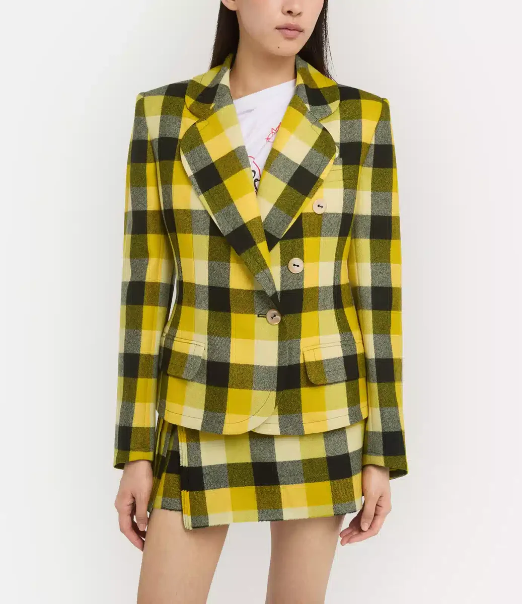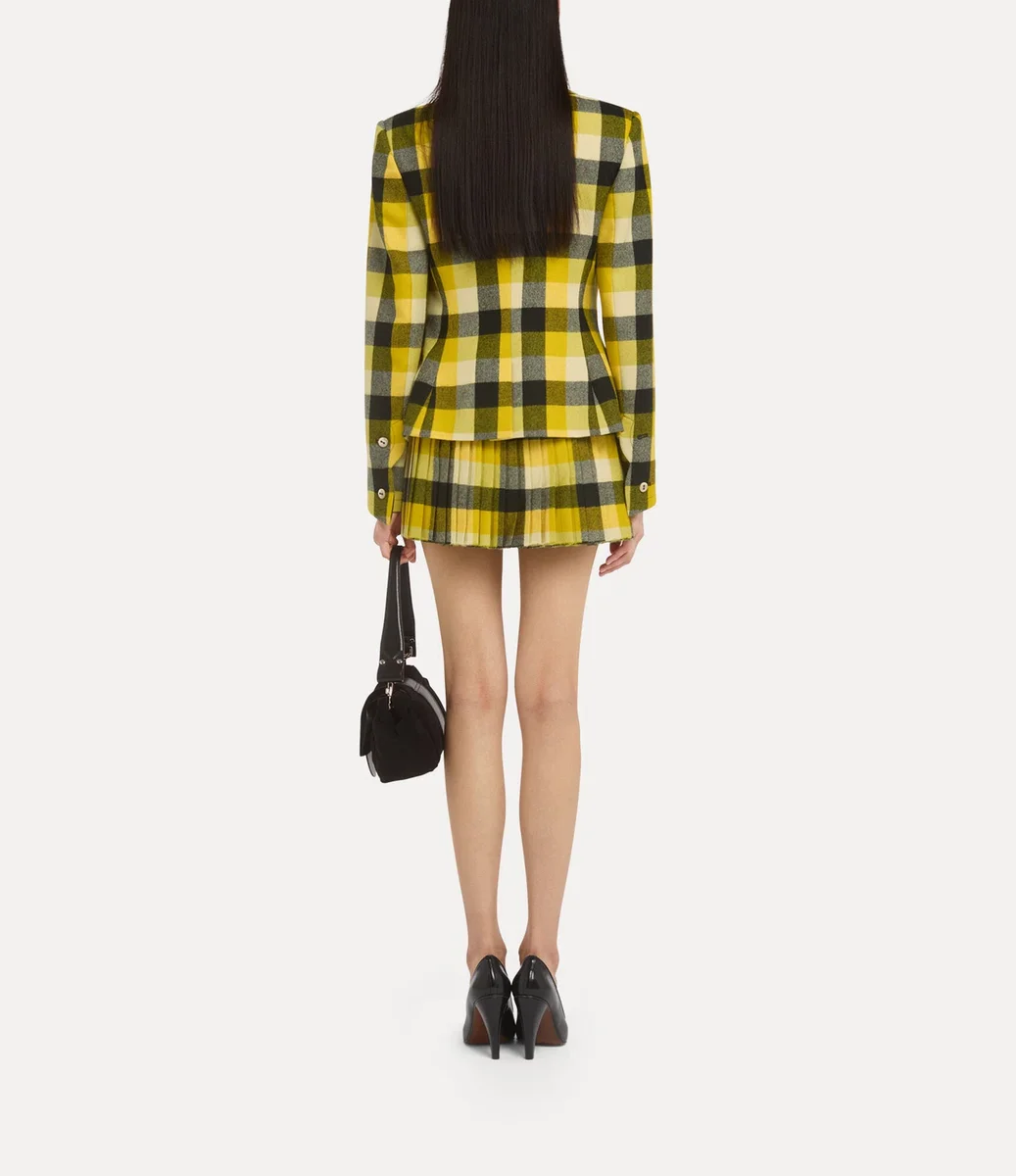 Het Georgia-jasje van Vivienne Westwood is gemaakt van wol en voorzien van het ‘Pixel’-ruitmotief van dit seizoen. Het jasje sluit met een parelmoeren knoop.
