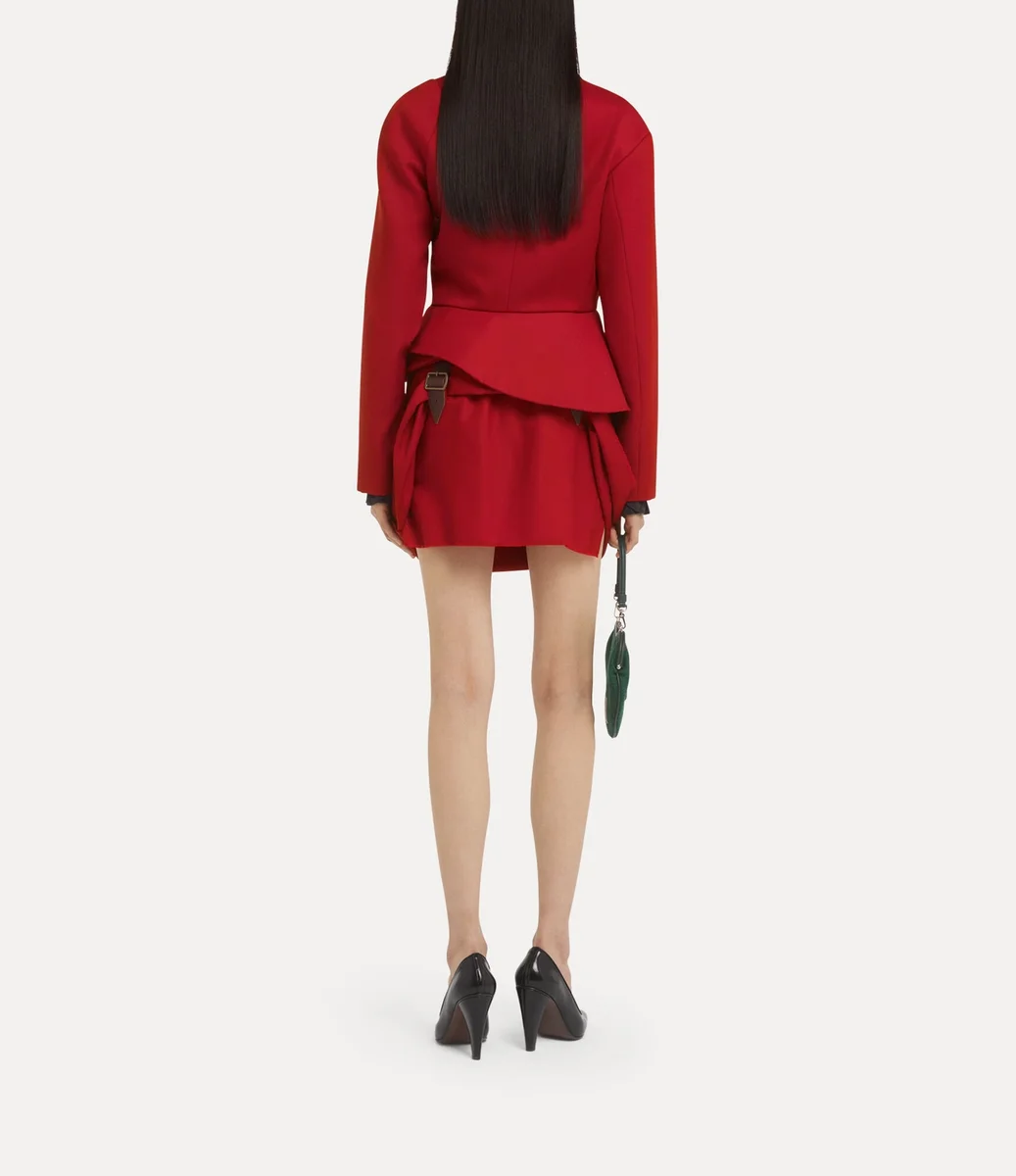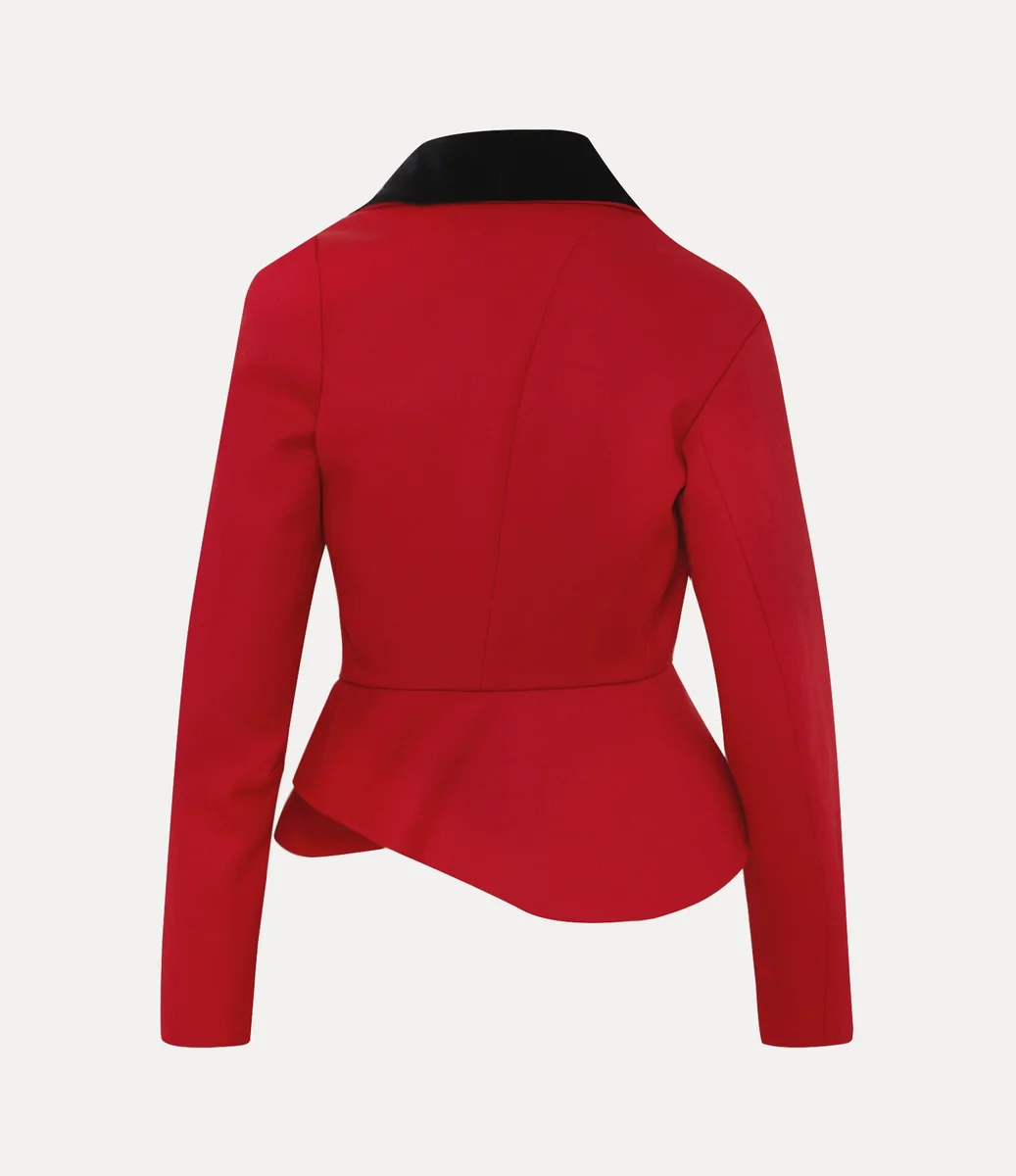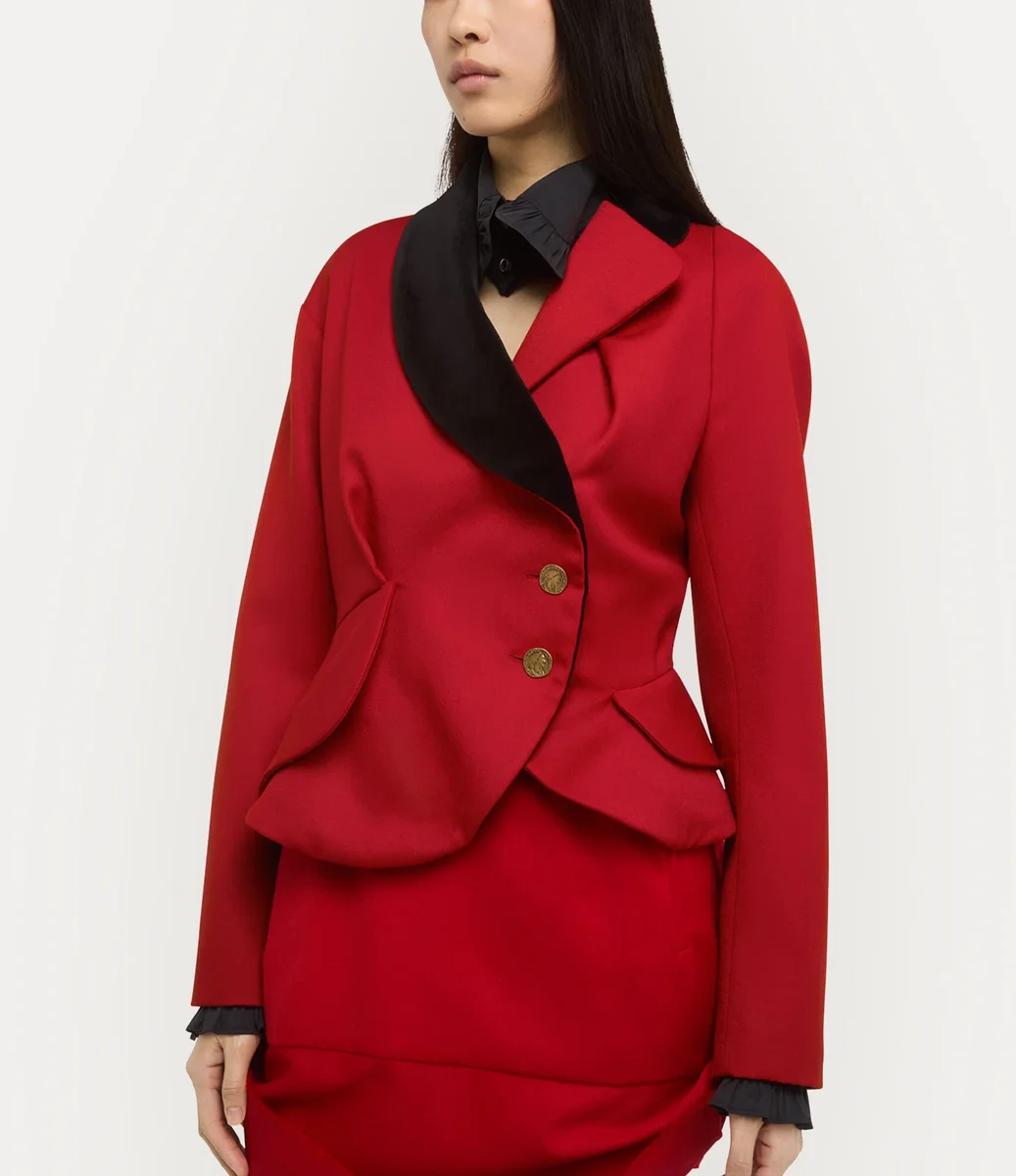 Het Stormy-jasje van Vivienne Westwood heeft een contrasterende zwarte sjaalkraag en een asymmetrische sluiting aan de voorkant met twee goudkleurige knopen met reliëf.
