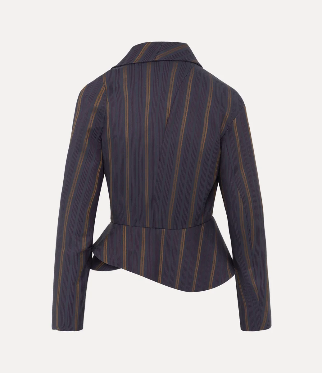 Ons Stormy-jack is gemaakt van een zachte katoenmix en heeft een marineblauwe basis met fijne verticale strepen in goud en bordeauxrood, omlijst door een gedrapeerde sjaalkraag. Delicate coupenaden geven vorm aan de taille en lopen uit in een gebeeldhouwde peplum-zoom, terwijl een speels ‘Coffee Stain’-motief de binnenkant accentueert.