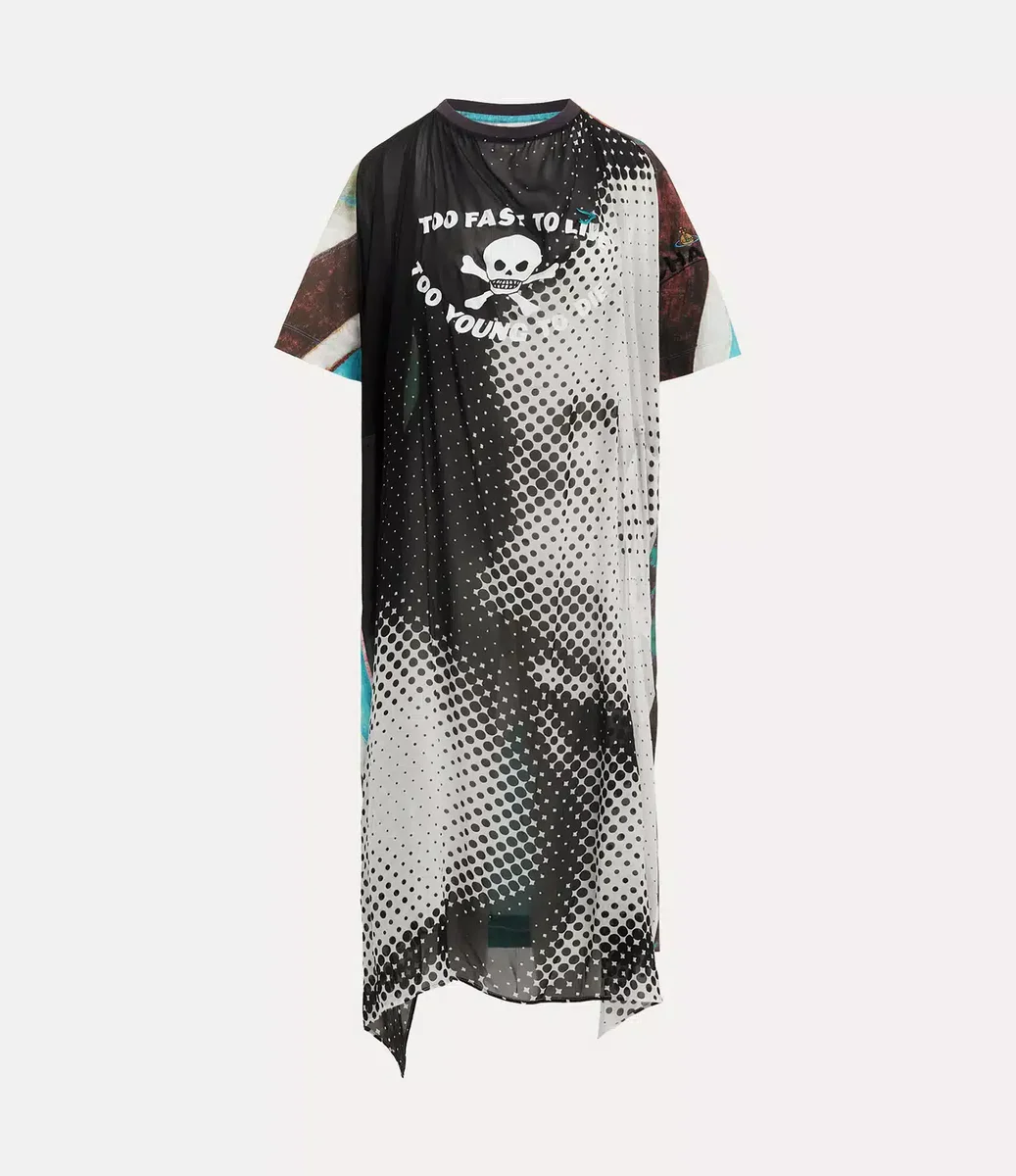De Worlds End Swing-jurk is versierd met het kenmerkende Union Jack-motief van het huis op de mouwen en de achterkant. Het kledingstuk wordt gecompleteerd door het embleem met de doodskop en gekruiste botten en de slogan “Too Fast to Live, Too Young to Die”, ontleend aan het uithangbord van onze iconische boetiek, nu bekend als Worlds’ End.