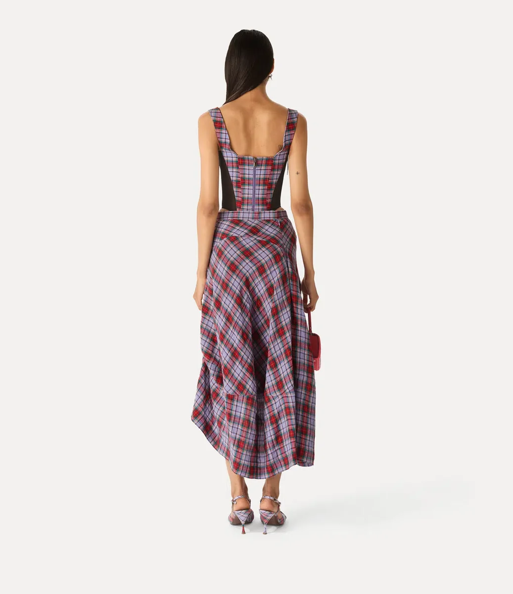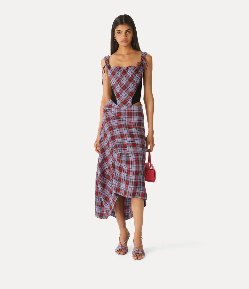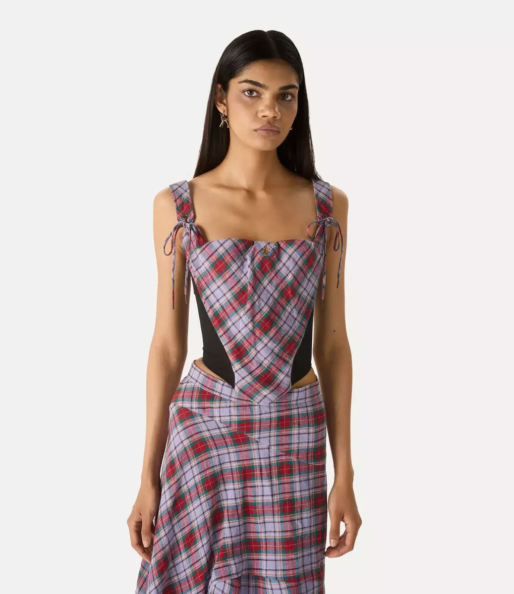 Ons Puppy-korset is dit seizoen opnieuw ontworpen met het opvallende ‘Louth Tartan’-motief, geweven in rode, groene en lila tinten, afgewerkt met een geborduurd veelkleurig bolmotief aan de voorkant. Het kledingstuk heeft een zacht gerimpelde vierkante halslijn met zelf te knopen bandjes, die doet denken aan silhouetten uit de 15e eeuw, synoniem voor Vivienne’s visie om traditie mee te nemen naar de toekomst.