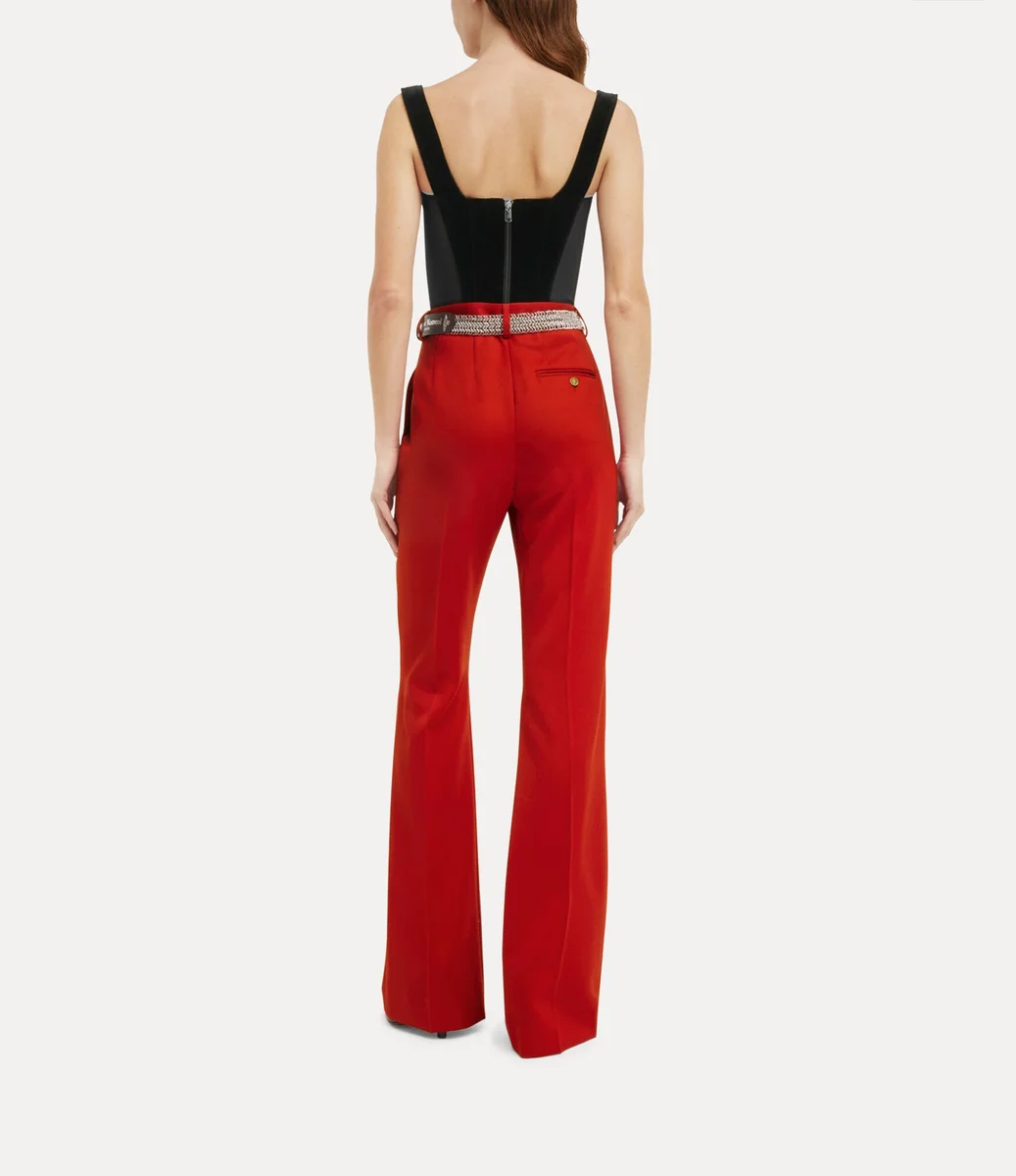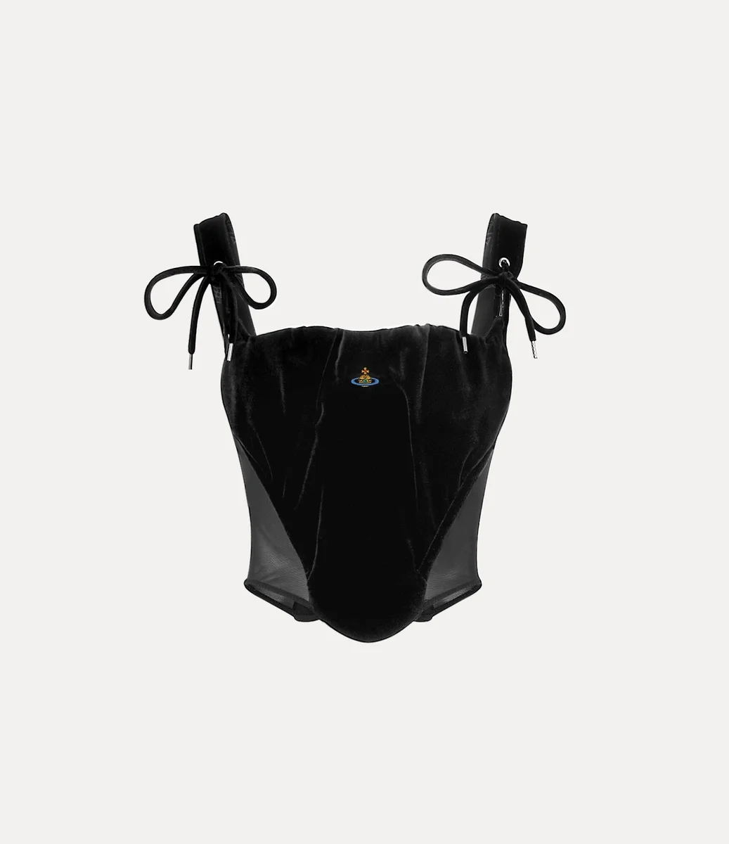 Het Puppy-korset, dit seizoen uitgevoerd in zwart fluweel, is een klassiek Vivienne Westwood-ontwerp dat wordt gekenmerkt door een strakke taille en een licht gebogen vierkante halslijn, een verwijzing naar historische 18e-eeuwse korsetten. Het ontwerp is afgewerkt met een driedimensionale orb-ritssluiting, die verwijst naar Vivienne’s visie om traditie mee te nemen naar de toekomst.