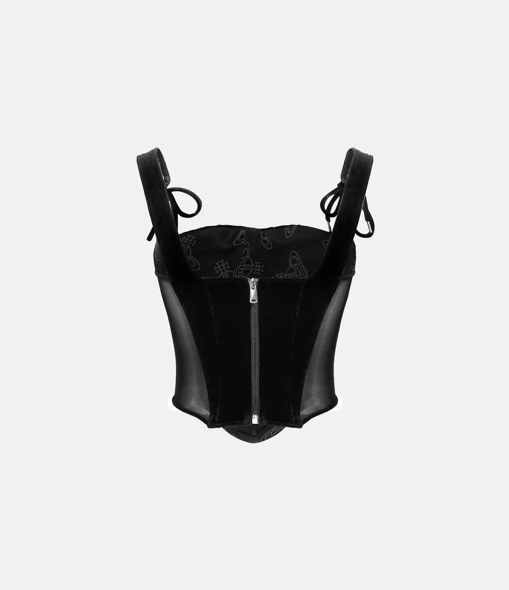 Het Vivienne Westwood Puppy-korset is gemaakt van zwart fluweel en wordt gekenmerkt door een strakke taille en een licht gebogen vierkante halslijn.