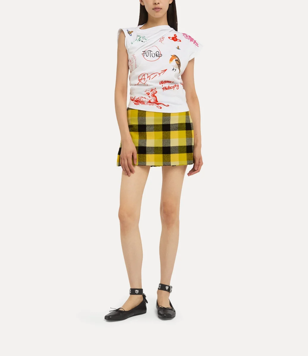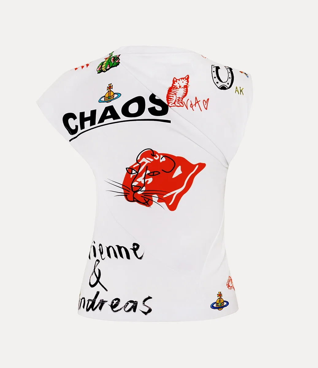 Onze klassieke Hebo-top is dit seizoen opnieuw ontworpen met het ‘Patches’-kunstwerk, waarmee de kenmerkende iconografie van het huis nieuw leven wordt ingeblazen, compleet met symbolen van geluk en rebellie. Het silhouet is gesneden met Vivienne’s schuine halslijn, omlijst door zachte draperieën en een gedraaid detail aan de achterkant.