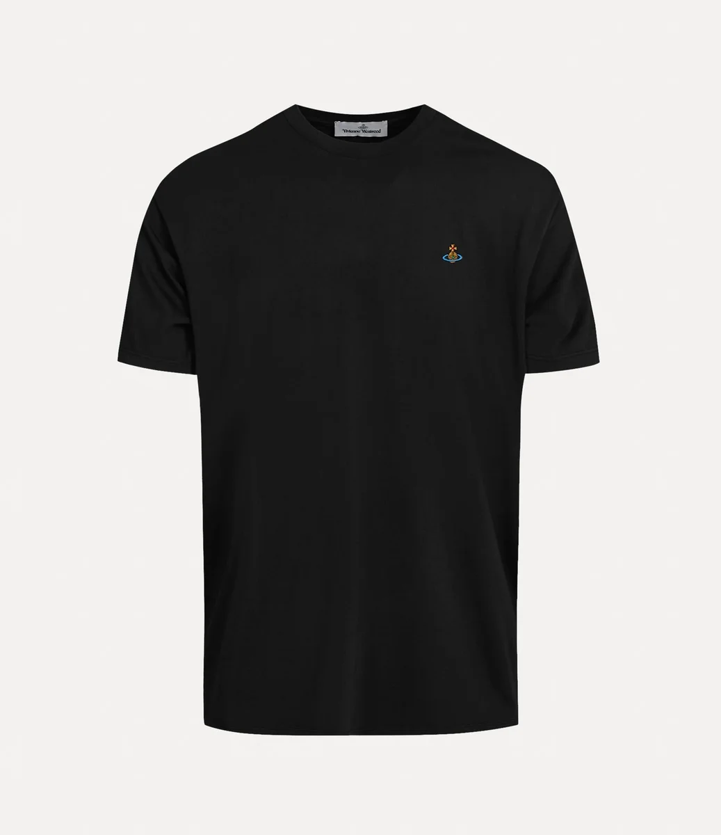 Ons klassieke T-shirt heeft een zacht katoenen silhouet, korte mouwen en een ronde halslijn. Het kledingstuk is voorzien van een veelkleurig orb-borduursel aan de linkerkant van de borst, wat synoniem staat voor Vivienne’s visie om traditie mee te nemen naar de toekomst.