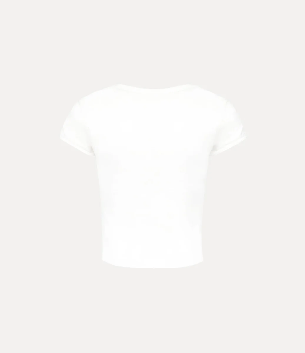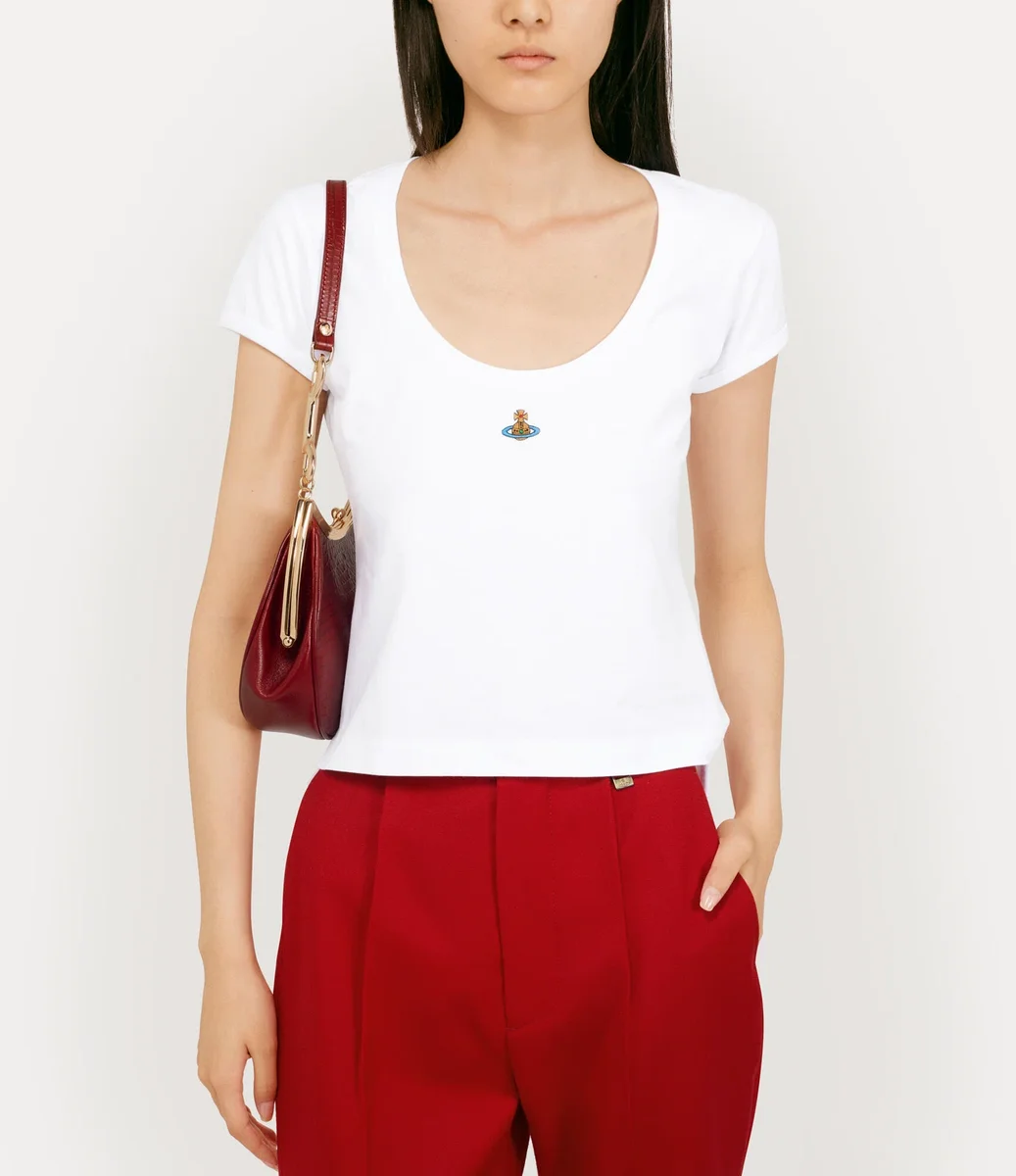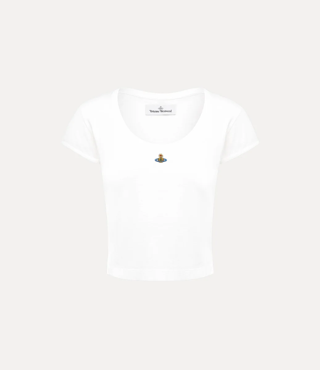 Ons Micro Lollo T-shirt heeft een kort katoenen silhouet, korte mouwen en een lage ronde halslijn. Het kledingstuk is voorzien van een veelkleurig orb-borduursel op het midden van de borst, dat symbool staat voor traditie, omringd door de hemelse ringen van Saturnus, die de toekomst vertegenwoordigen.