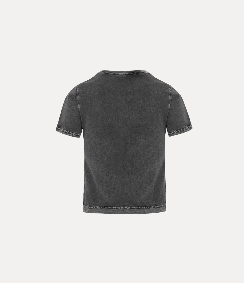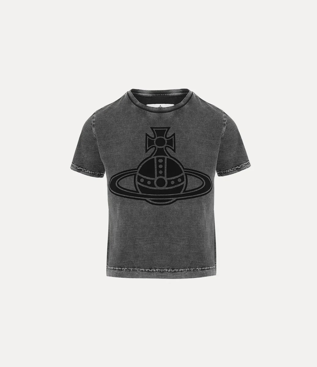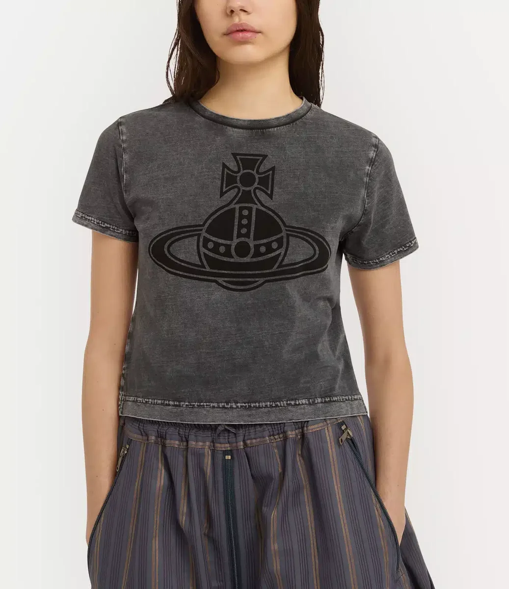 Ons Paris Orb Mini Peru T-shirt is gemaakt van lichtgewicht katoenen jersey en heeft een cropped silhouet met een klassieke ronde halslijn die overgaat in een asymmetrische getrapte zoom. Het kledingstuk is versierd met het orb-motief van het huis en weerspiegelt Vivienne’s visie om traditie naar de toekomst te brengen.