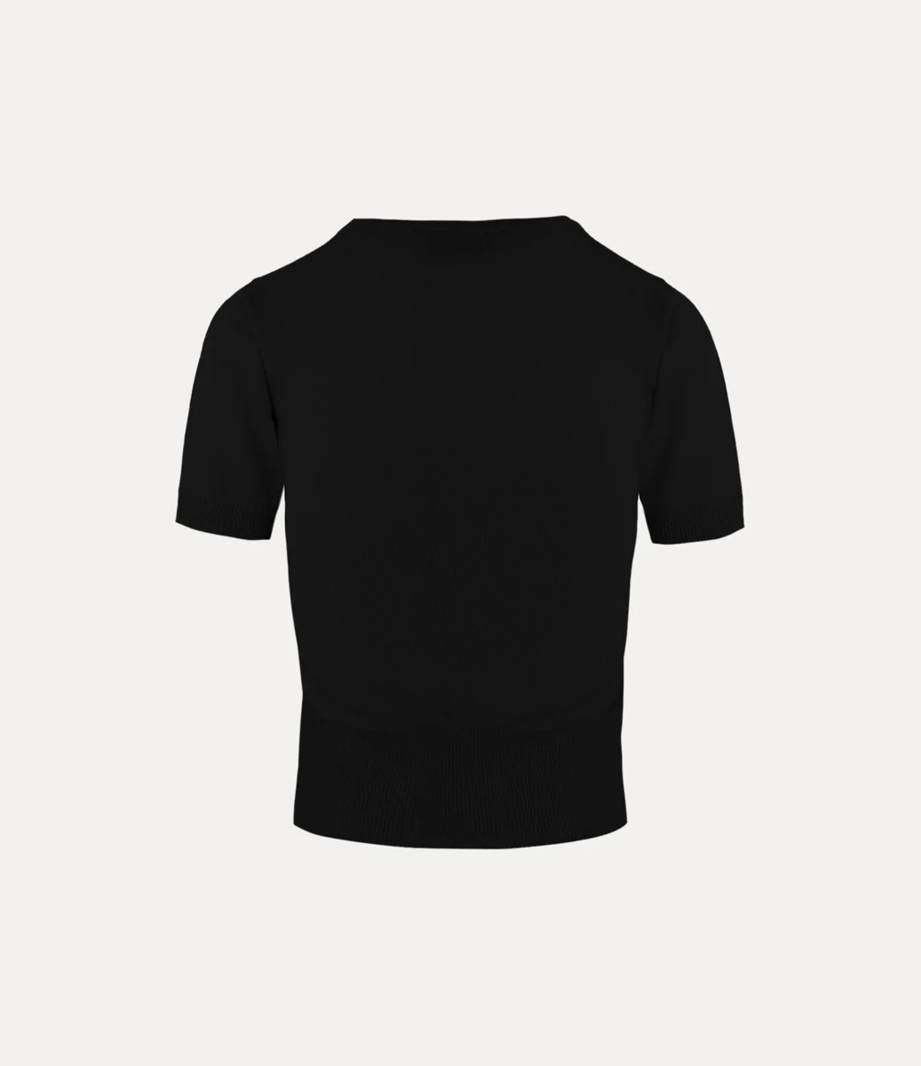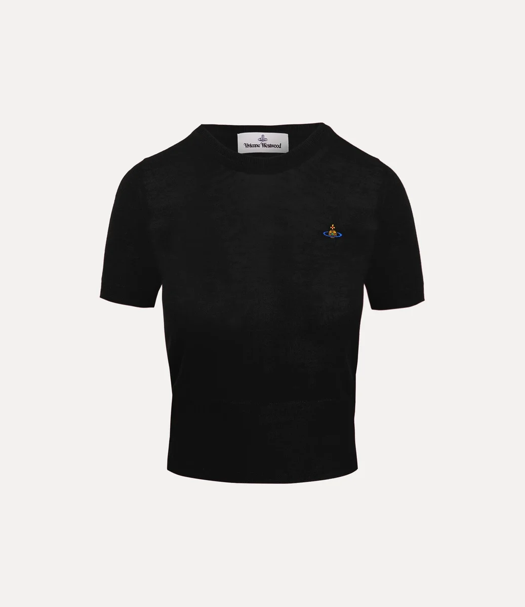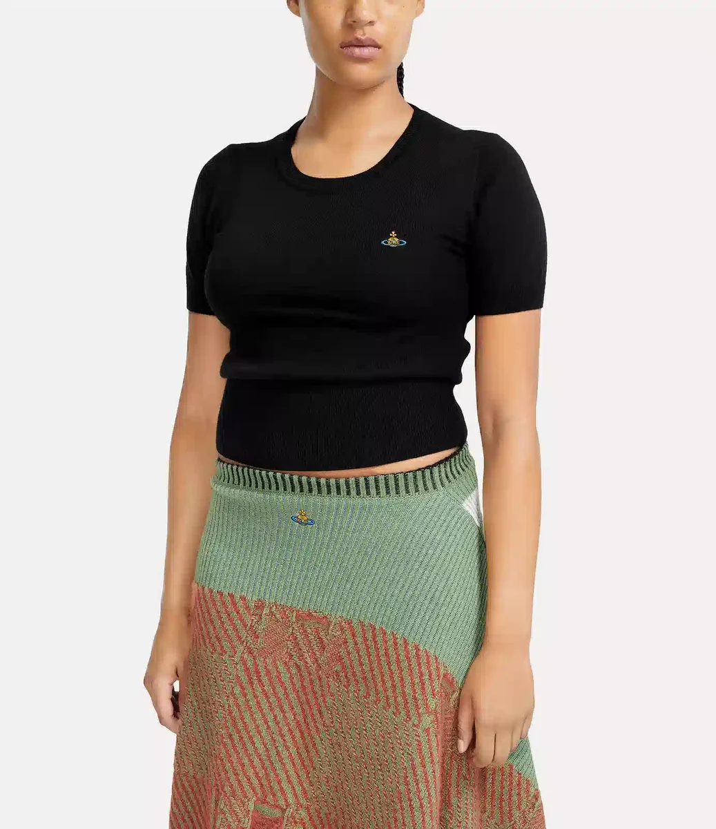 De Bea-top van Vivienne Westwood is dit seizoen vernieuwd. De katoenen kasjmier top met korte mouwen heeft geribde randen en een geborduurde veelkleurige bol.