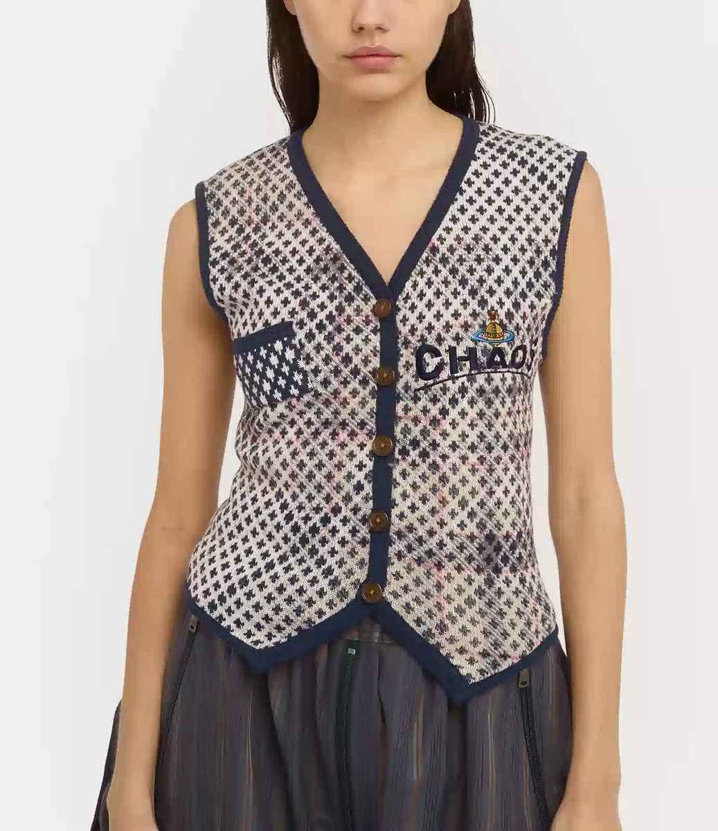 Ons Distressed Tartan vest is gemaakt van een zachte katoen-wolmix en heeft een patroon van het archiefmotief Crosses argyle jacquard, bedekt met een ‘Distressed’ tartanprint. Het vest heeft een V-halslijn en is afgewerkt met een rij knopen aan de voorkant. Het is geborduurd met een orb-motief en het iconische ‘CHAOS’-motief.