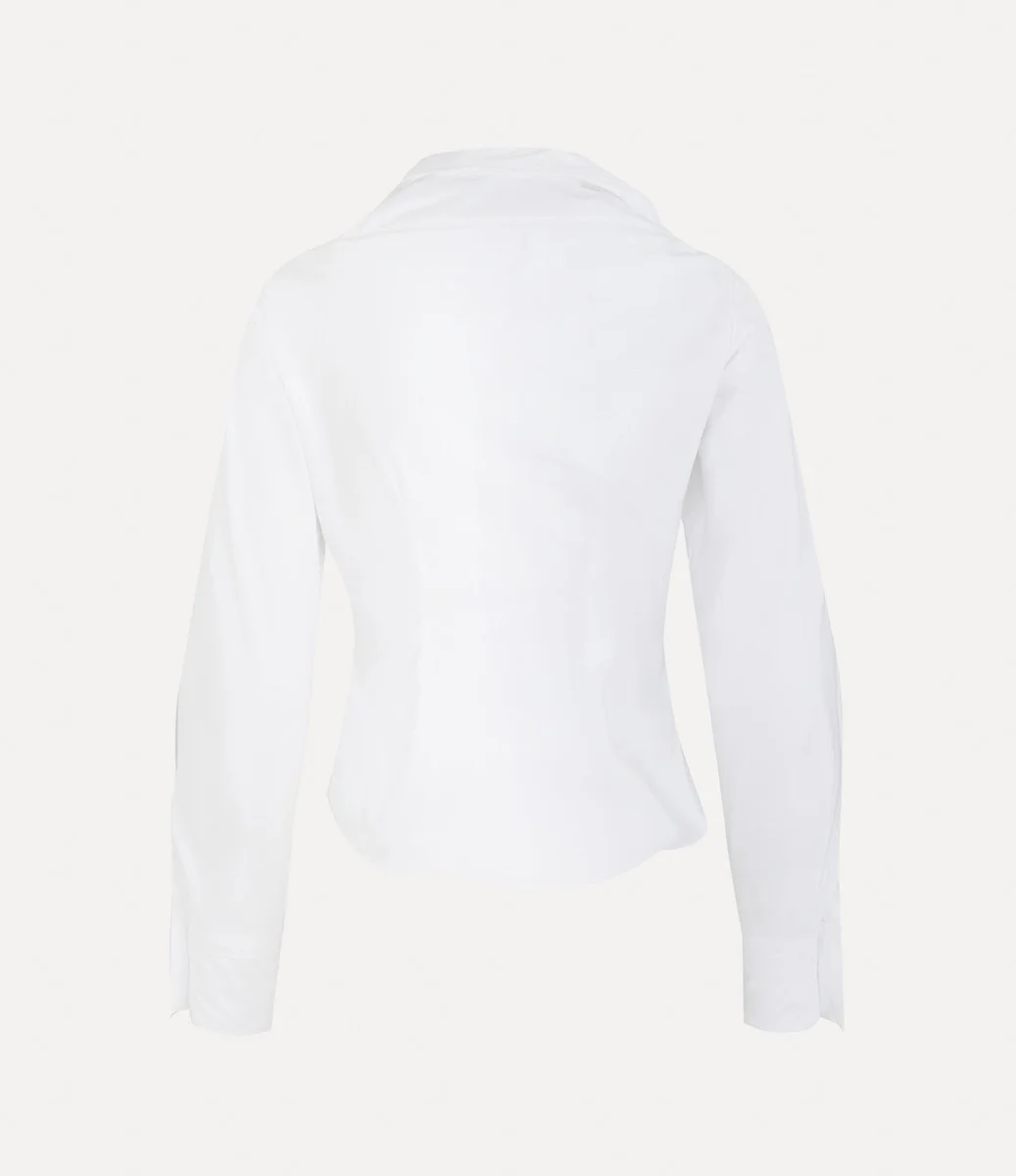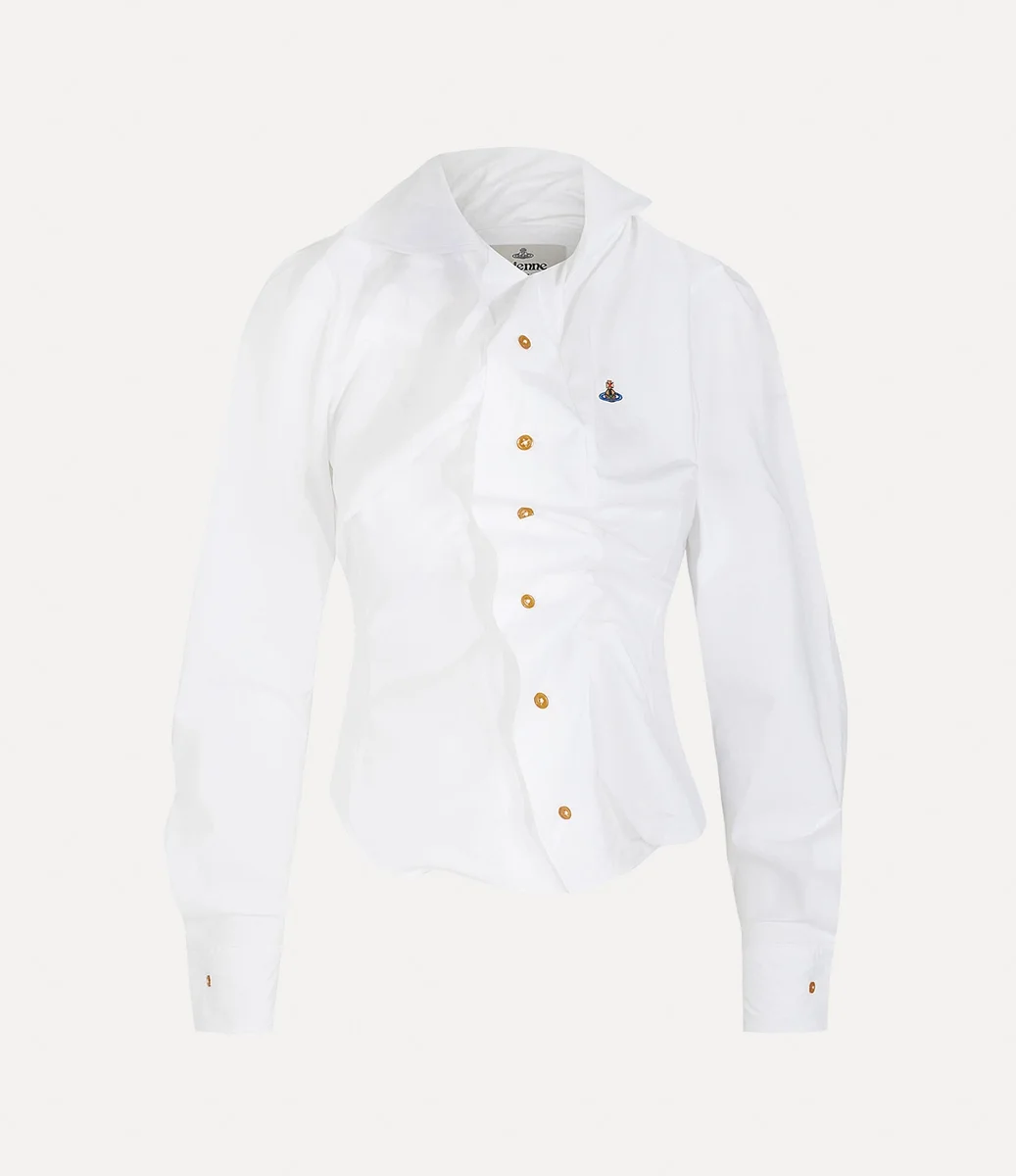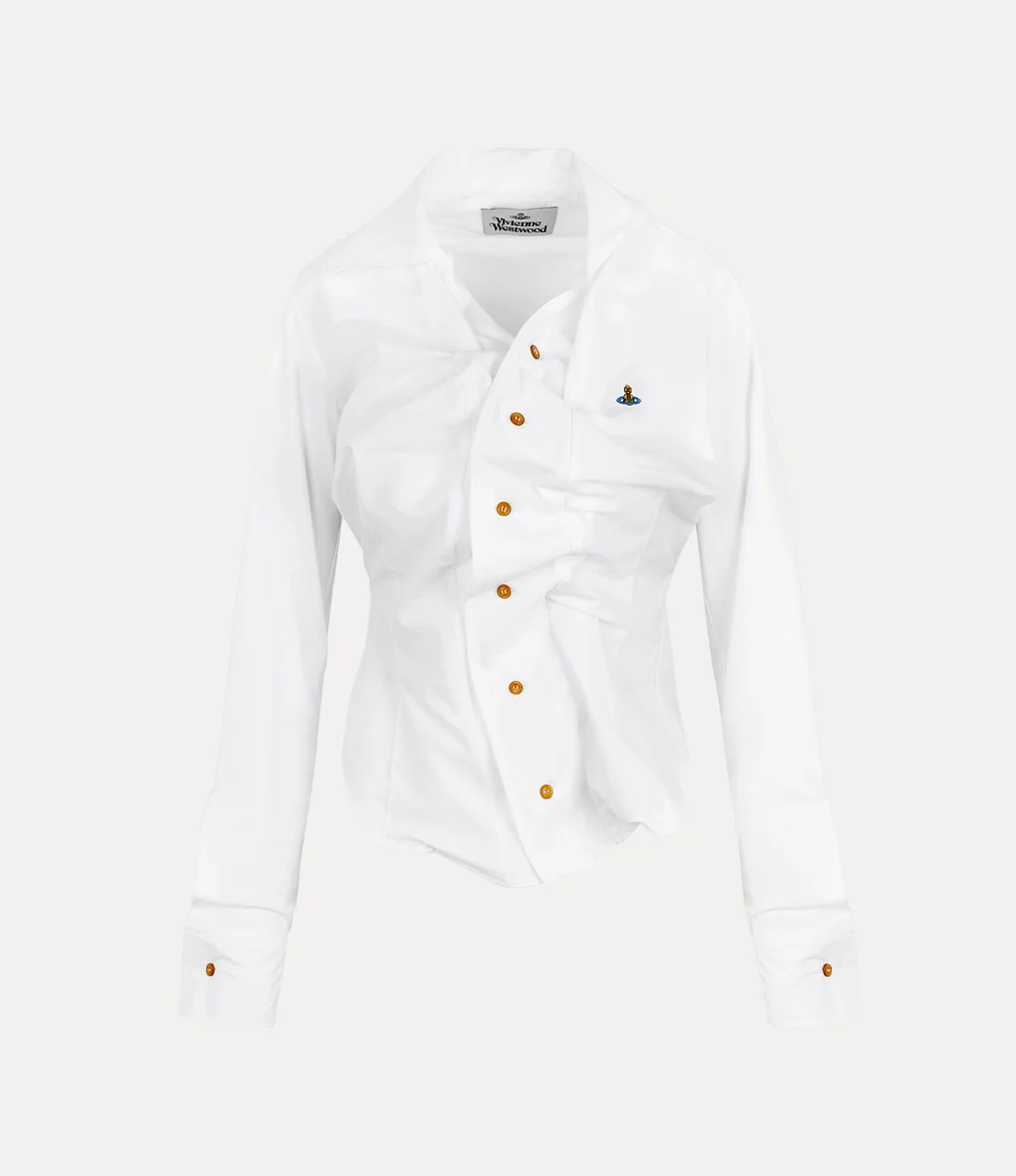 Het Vivienne Westwood Drunken-shirt van katoen heeft een excentrische knoopsluiting met een asymmetrische zoom en een knoopsluiting.