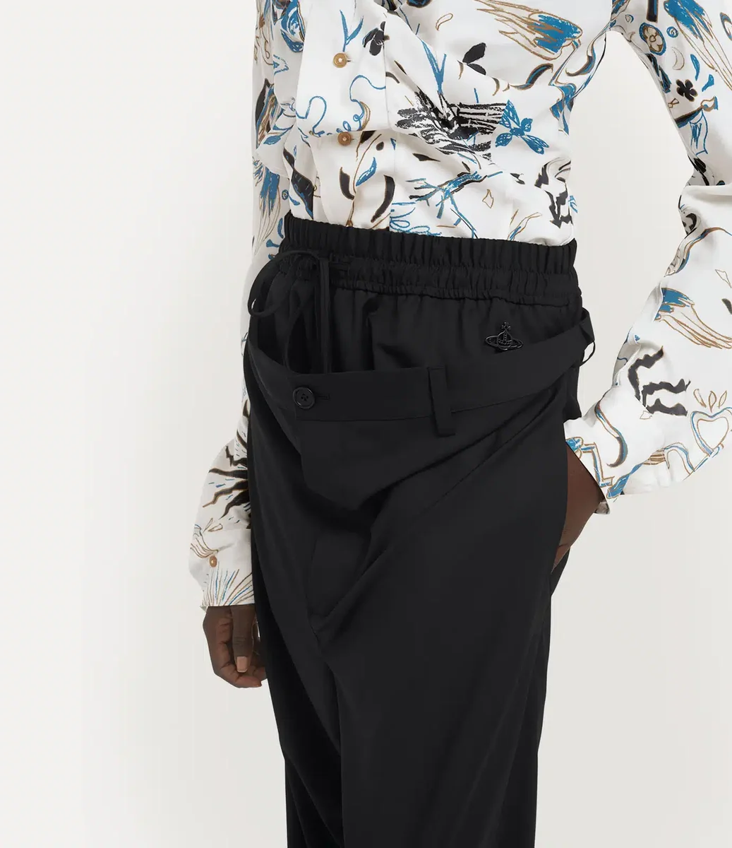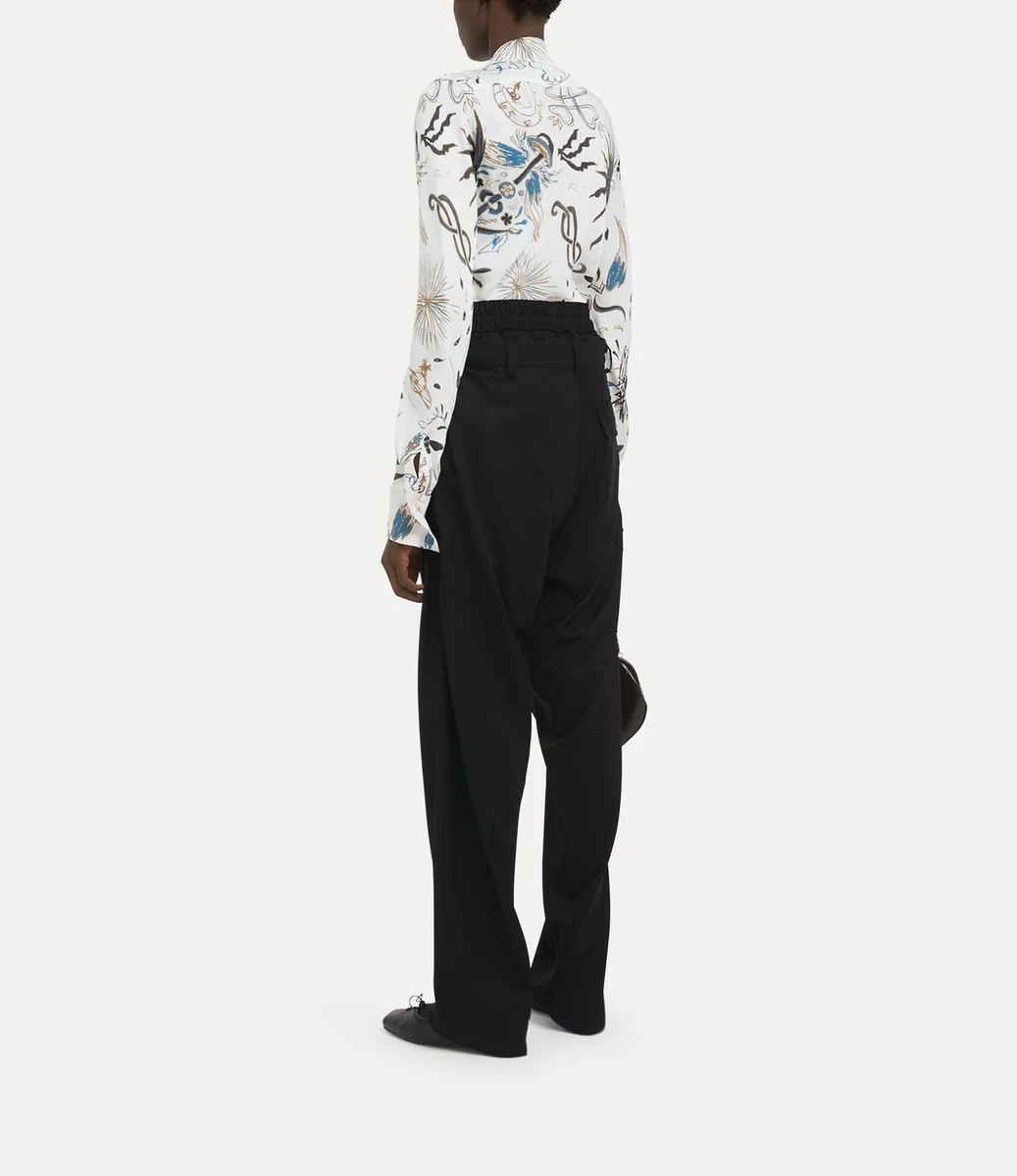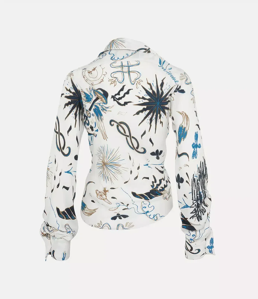 Ons Drunken shirt is ontworpen met Vivienne’s experimentele drunken tailoring-systeem en heeft een excentrische knoopsluiting en een asymmetrische zoom. Het shirt is geïnspireerd op ‘De lachende cavalier’ van Frans Hals en is bedrukt met een abstract grafisch ontwerp waarin de kenmerkende iconografie van het huis is verwerkt.