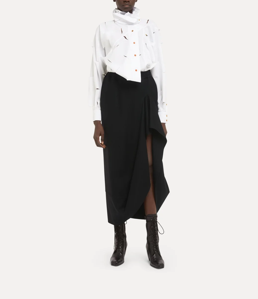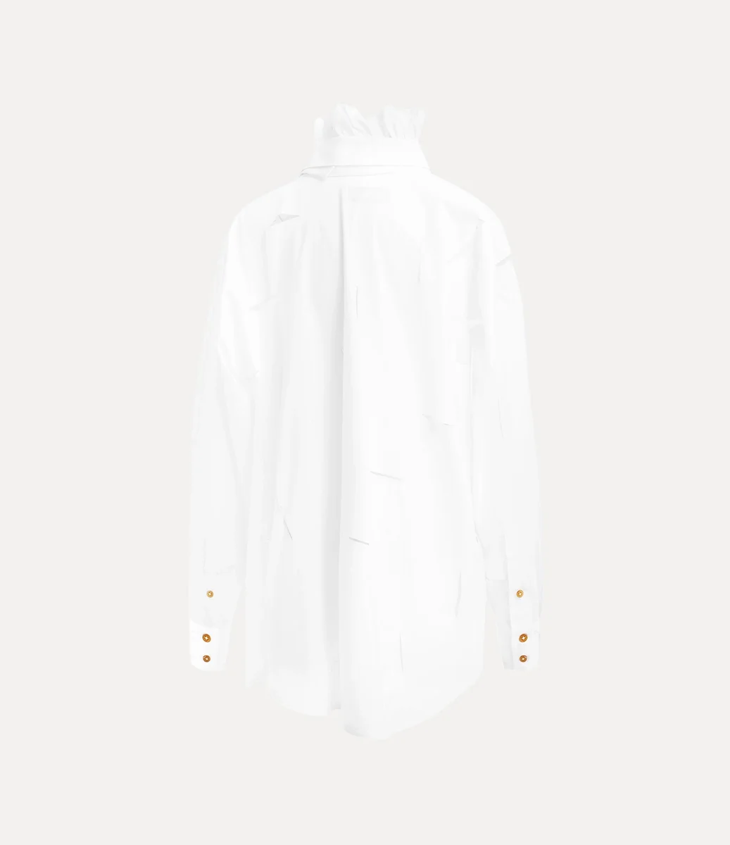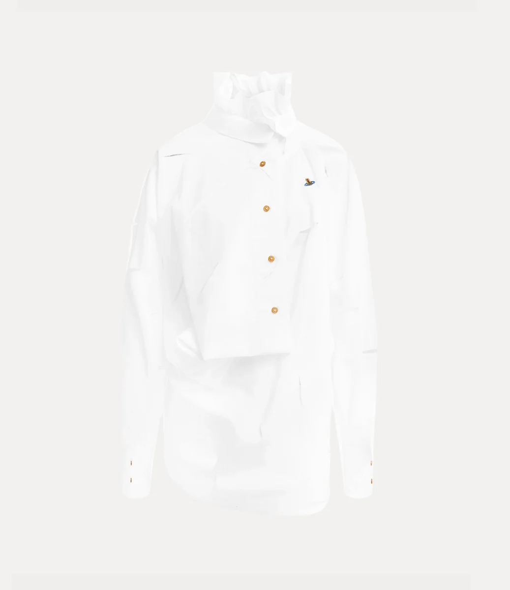 Onze Halston-blouse is geïnspireerd op Tudor-portretten en heeft een hoge kraag met ruches, die wordt vastgezet met een dubbele knoopsluiting. De zachte, sculpturale drapering valt elegant over het lichaam, terwijl ingewikkelde snijdetails het ontwerp sieren – een kenmerkend element dat voor het eerst werd geïntroduceerd in de Vivienne Westwood lente-zomercollectie 1991, ‘Cut, Slash and Pull’.