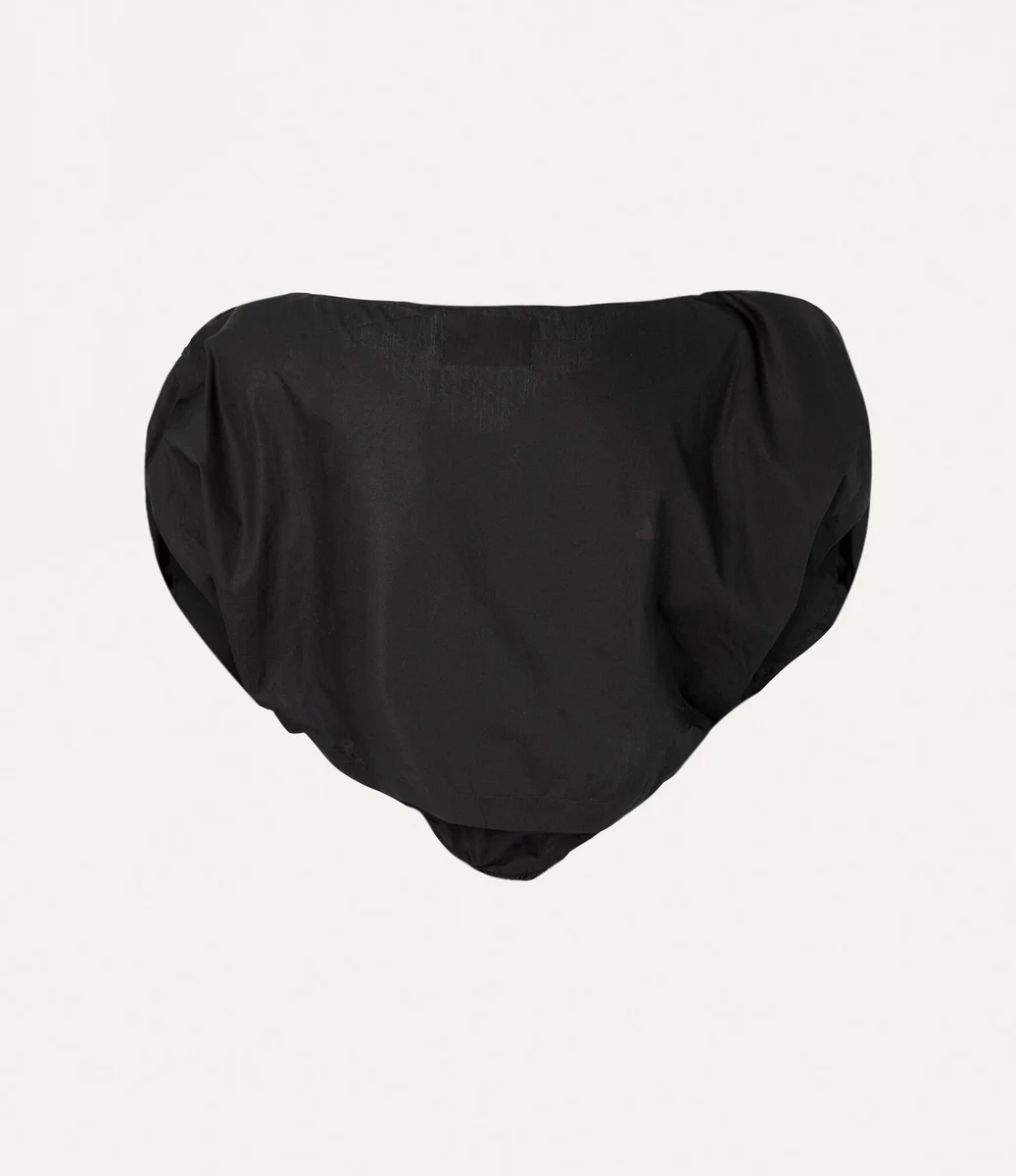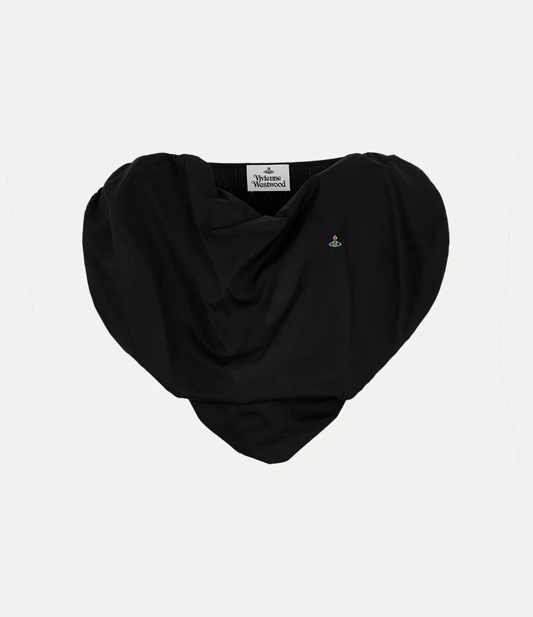 De asymmetrische hartvorm is een kenmerkend stijlelement van het huis geworden en is in veel collecties door de jaren heen teruggekomen. De Heart top van dit seizoen laat het silhouet herleven dat Vivienne gebruikte om haar liefde voor de mensheid en de planeet uit te drukken, compleet met een geborduurde bol aan de linkerkant van het ontwerp.