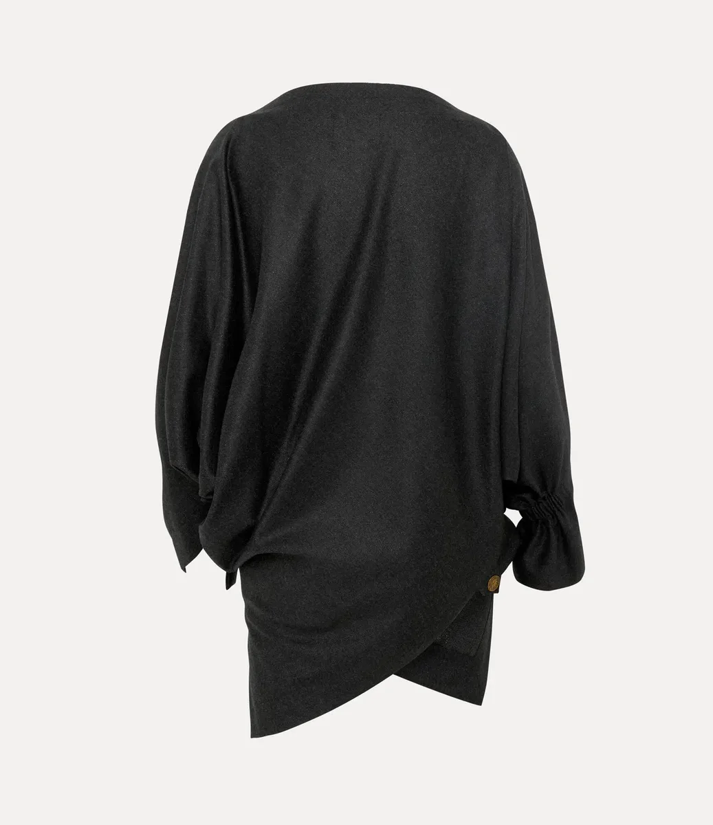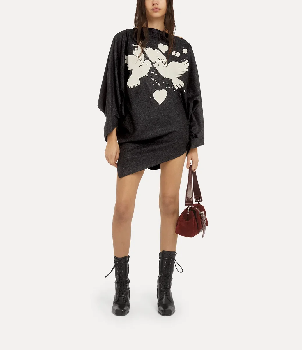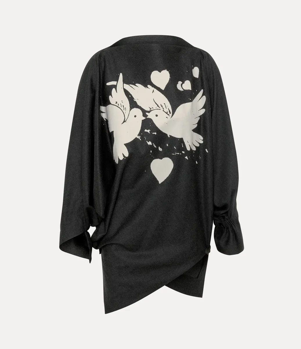 Onze Infinity-top is gemaakt van metallic geborstelde wol en versierd met het ‘Dove and Heart’-kunstwerk. De top heeft lange mouwen die bij de polsen zijn gerimpeld, een brede boothals en verlaagde schouders, en valt in een oversized silhouet dat eindigt in een asymmetrische zoom.