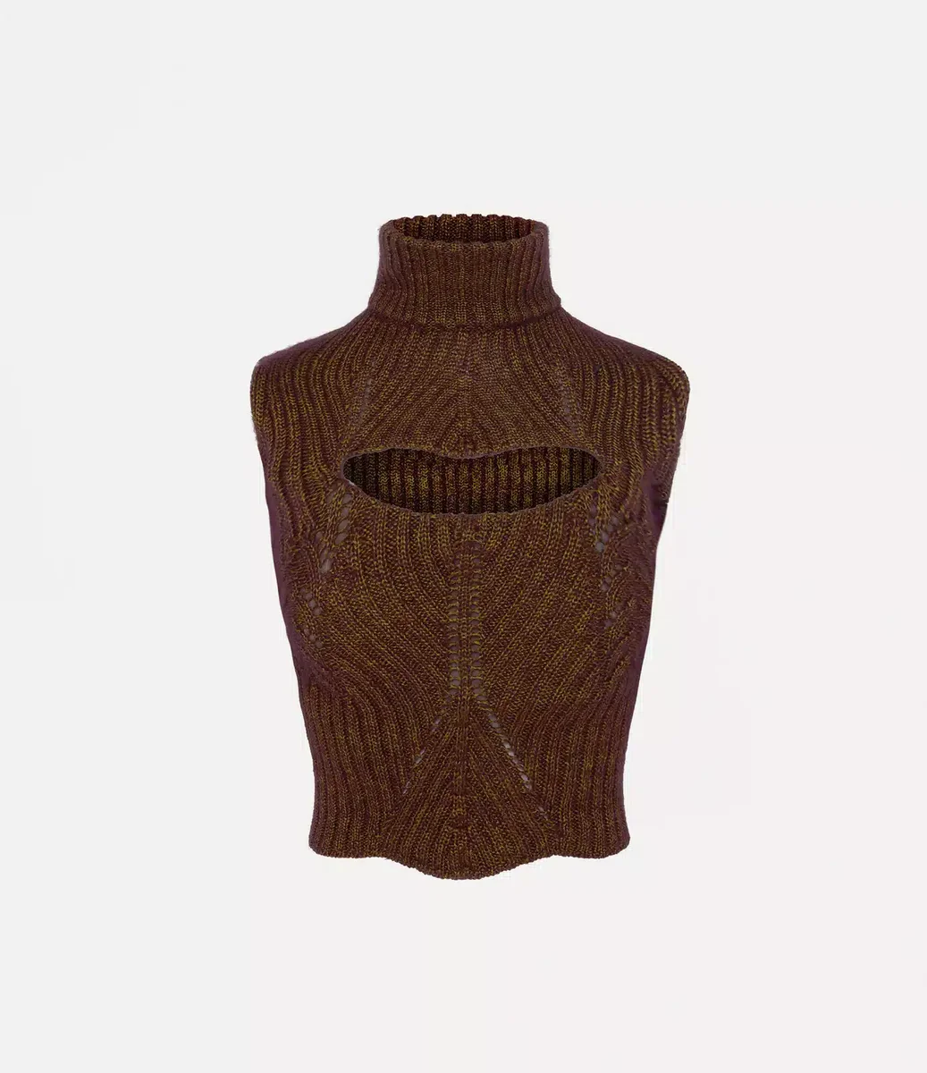 De mouwloze Mary Corset top is gemaakt van een mix van zijde en mohair, gecombineerd met visgraat- en ribbelsteek. De top heeft een horizontale split boven de borst, met een korsetachtige beha onder de gebreide laag voor ondersteuning, en is afgewerkt met ribbels langs de hoge halslijn en over het hele ontwerp.
