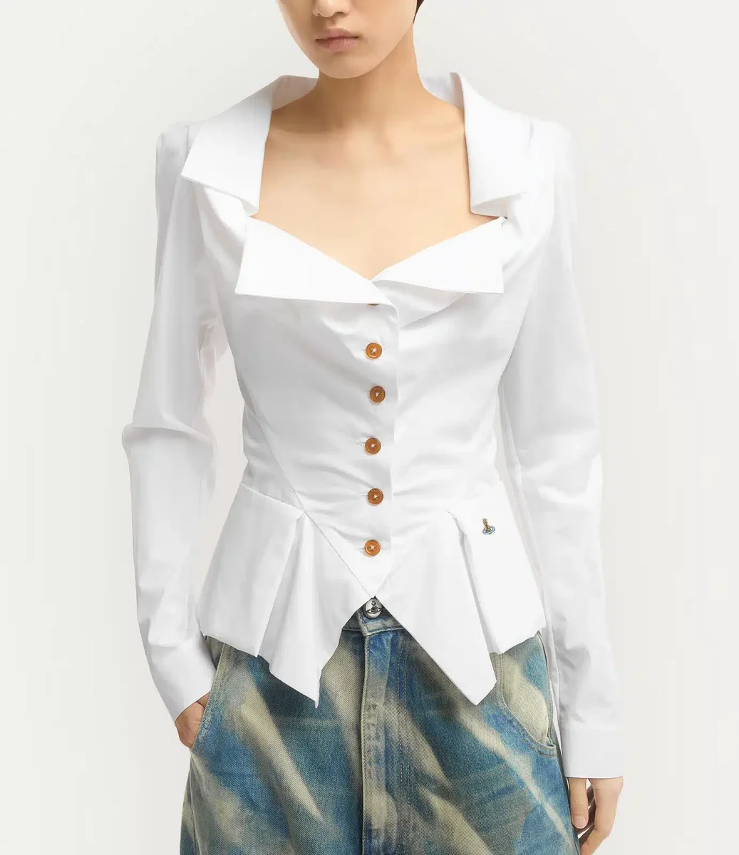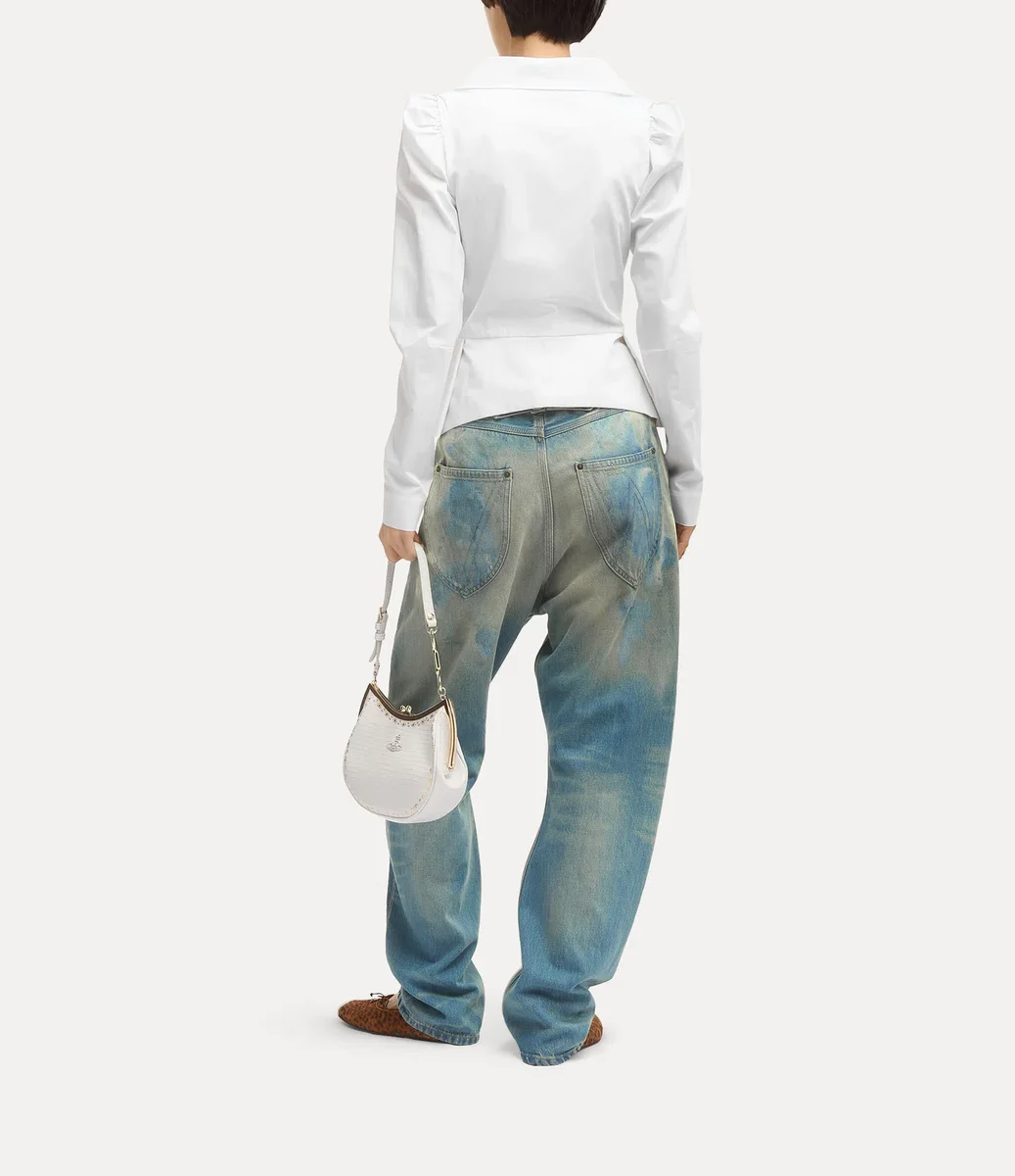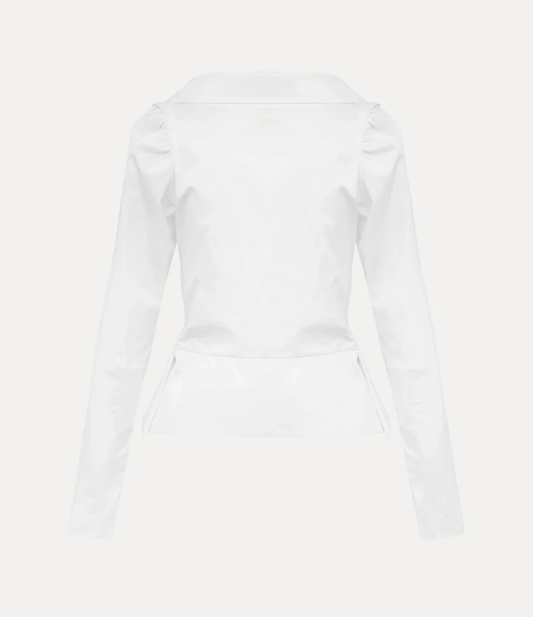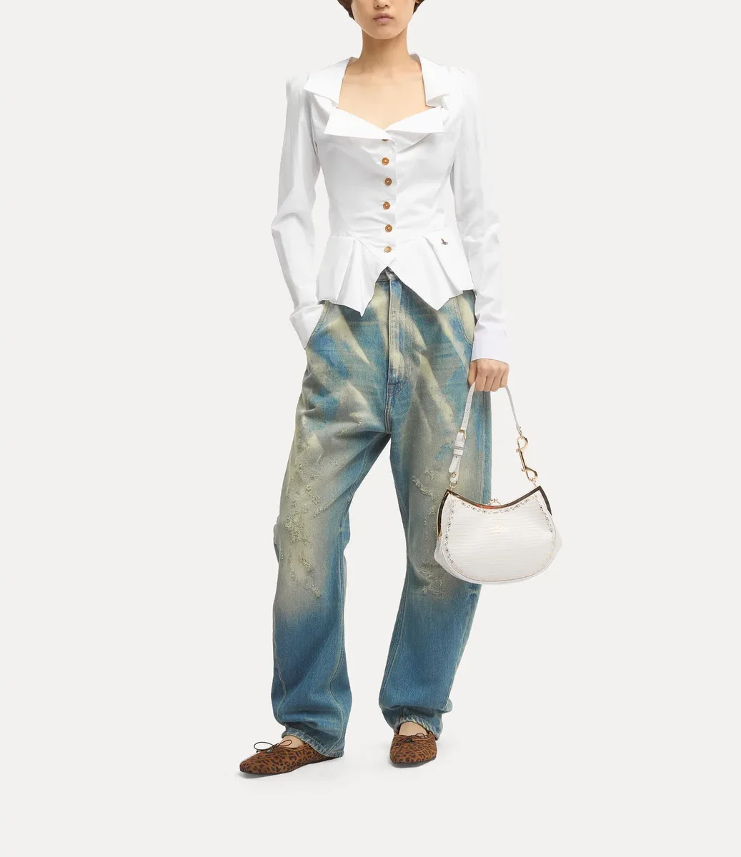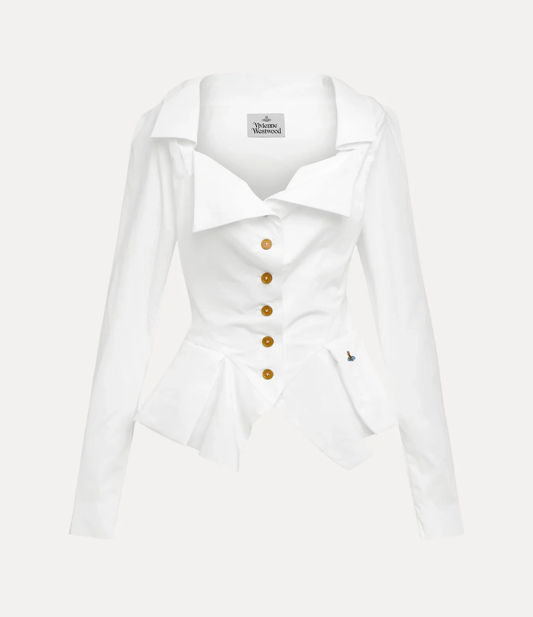 Het Monday-shirt heeft origami-achtige plooien rond de halslijn, versierd met knoopsluitingen aan de voorkant en ons kenmerkende veelkleurige orb-borduursel op de heup. Het kledingstuk creëert een silhouet geïnspireerd op het Amerikaanse Midwesten van de jaren 30, met een getailleerd lijfje met een uitlopende, geplooide stofverlenging bij de taille en elegant gepofte schouders.