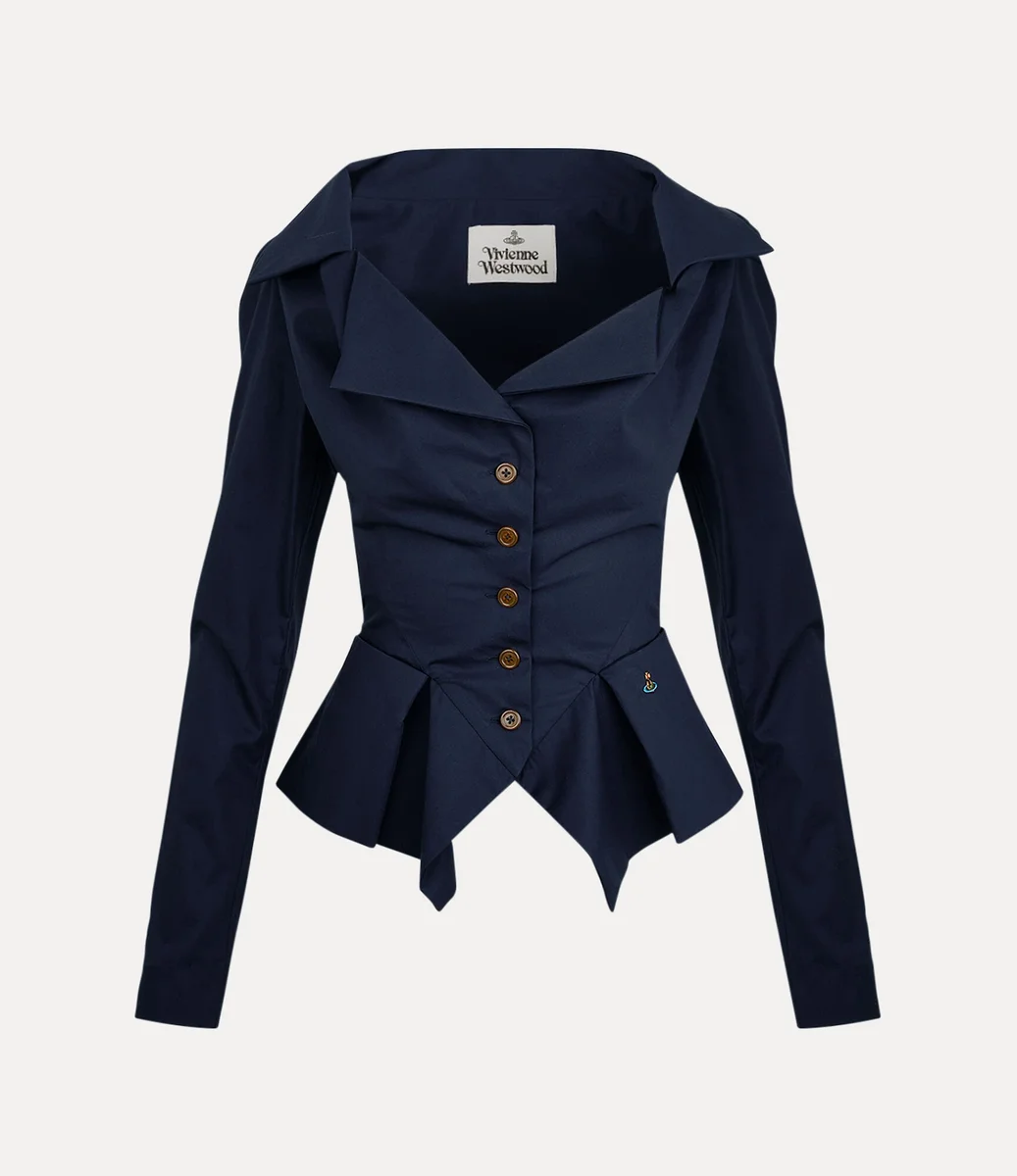 Ons Monday shirt heeft origami-achtige plooien rond de halslijn, versierd met knoopsluitingen met gegraveerde letters en ons kenmerkende veelkleurige orb-borduursel op de heup. Het kledingstuk heeft een getailleerd lijfje met een uitlopende, geplooide stofverlenging bij de taille, afgewerkt met elegante pofmouwen.