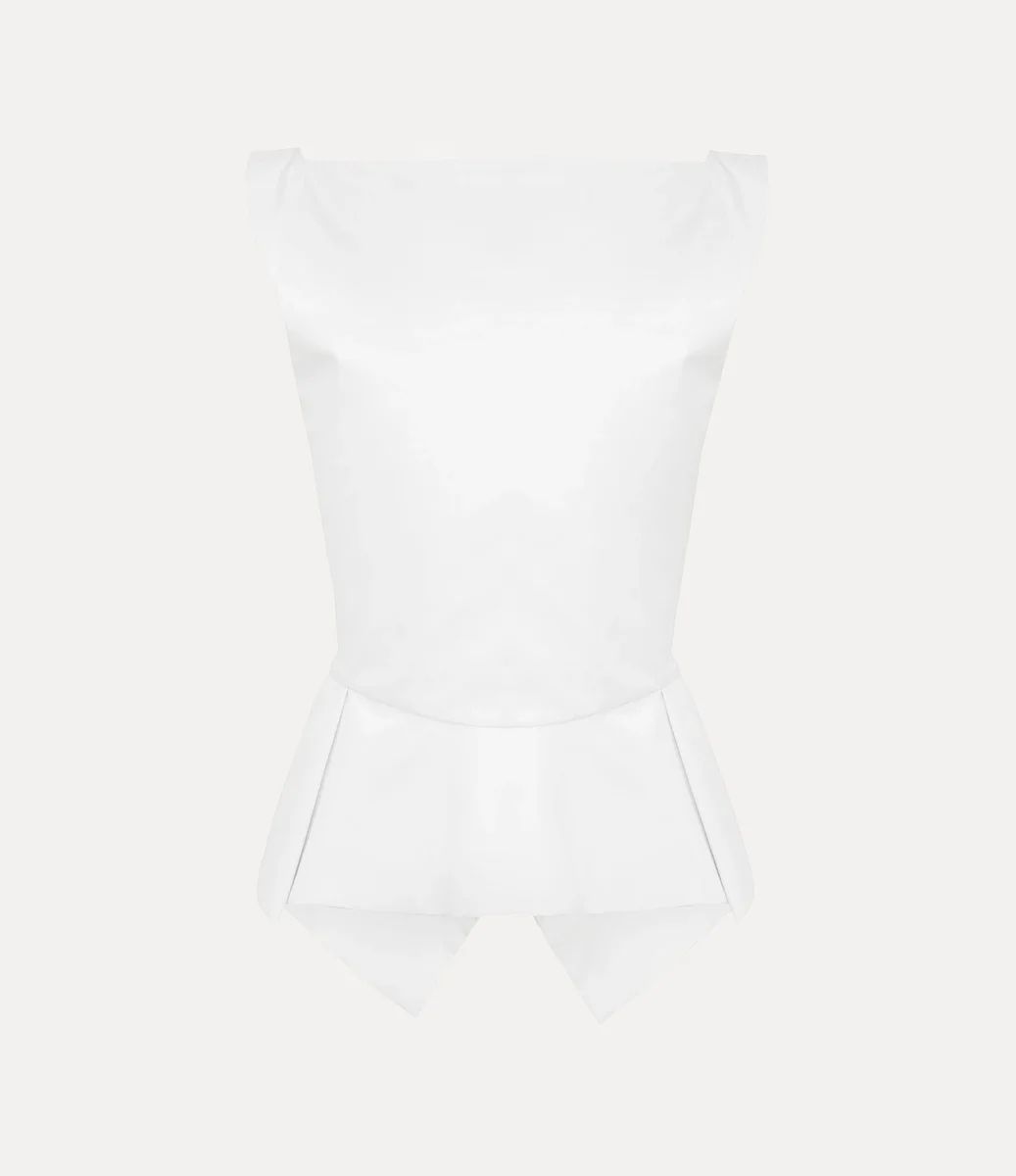 Ons Monday-vest volgt een archiefsilhouet dat voor het eerst werd gepresenteerd in de lente-zomercollectie van 1997, ‘Viva la Bagatelle’. Het kledingstuk heeft een klassieke vierkante halslijn en valt zachtjes in een uitlopende peplum-zoom die samenkomt in delicate plooien en een omgekeerd V-ontwerp aan de voorkant.