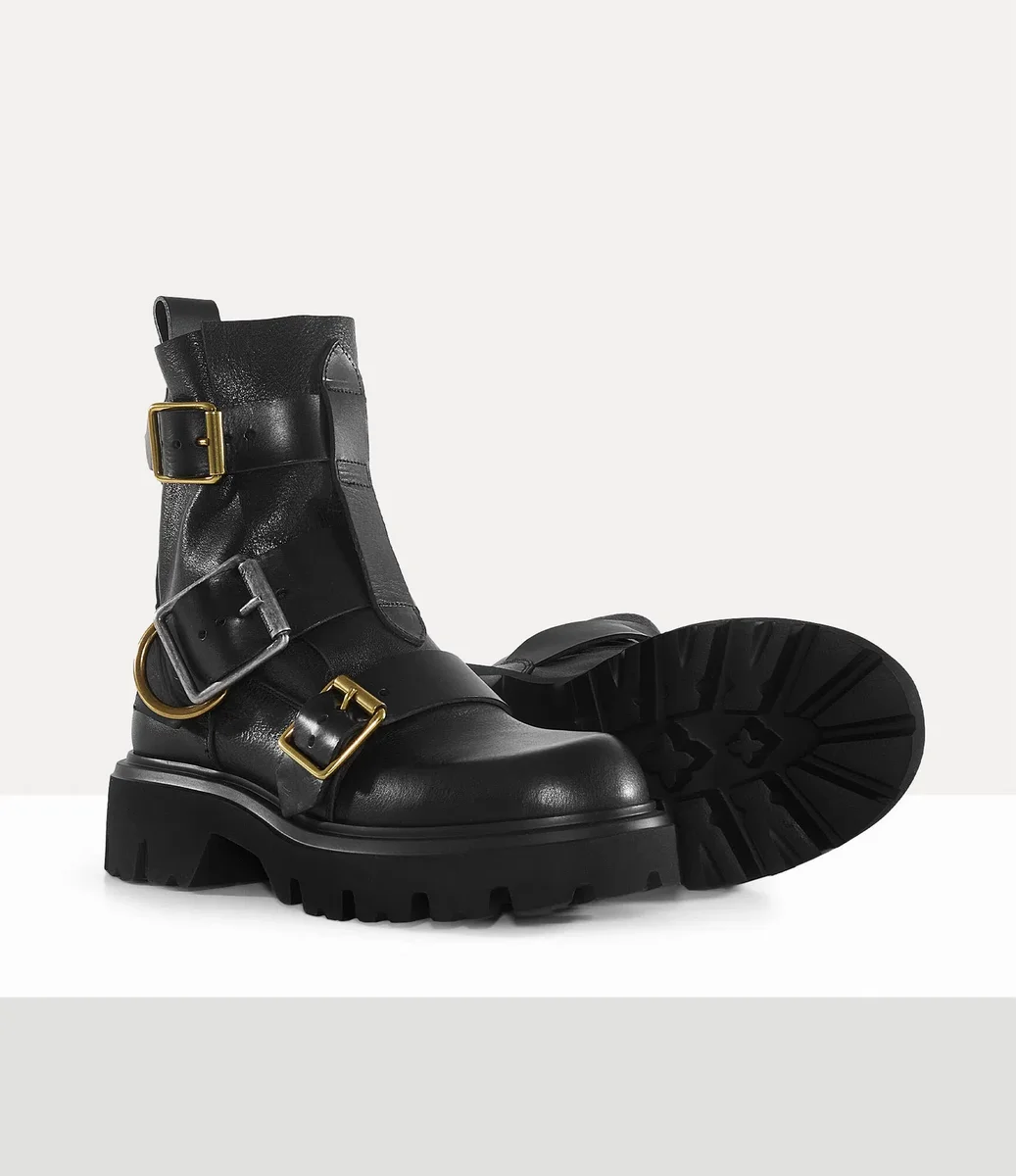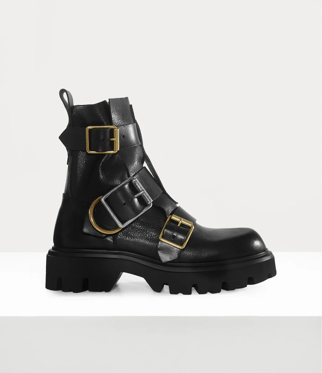 De Empire-laarzen zijn geïnspireerd op de archieflaarzen van Rome, die voor het eerst werden geïntroduceerd in de herfst-wintercollectie van 1983. Het ontwerp heeft een geoliede lederen afwerking, versierd met leren riemen en rollersluitingen, die thema’s van beperking en controle oproepen, geïnspireerd door bondage en fetisjkleding.