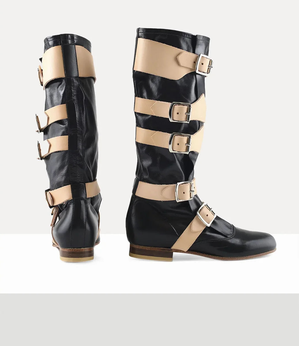 Onze Pirate-laarzen werden voor het eerst onthuld in de herfst-wintercollectie ‘Pirate’ van 1981, die was geïnspireerd door Viviennes interesse in avontuurlijke piratenverhalen uit de 17e en 18e eeuw. Het ontwerp vangt de essentie van romantiek en rebellie die vaak met piraten wordt geassocieerd, met een omwikkelde, zachte, slobberige leren schacht en zware leren riemen met rolgespen die de laarzen een ruige, verweerde uitstraling geven.