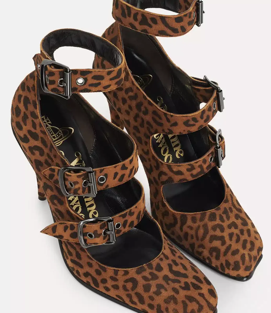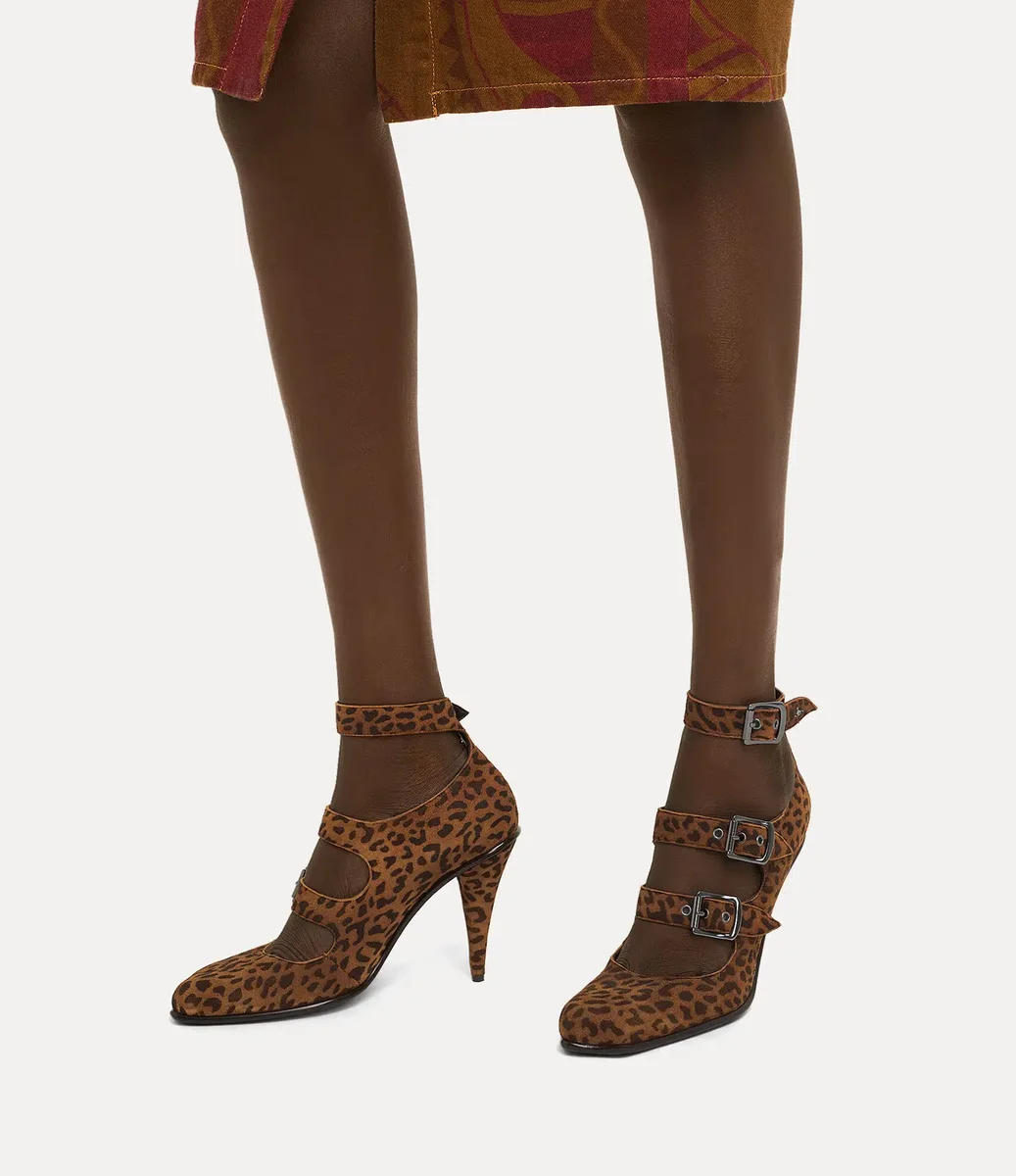 Onze Savage-hakken hebben een anatomisch silhouet dat is geïnspireerd op het kenmerkende ‘Animal Toe’-motief van het huis, dat voor het eerst werd geïntroduceerd in de lente-zomercollectie 2000, ‘Summertime’. Het model is gemaakt van leer, bedrukt met vintage-geïnspireerd luipaardsuède en afgewerkt met gunmetal-kleurige hardware.