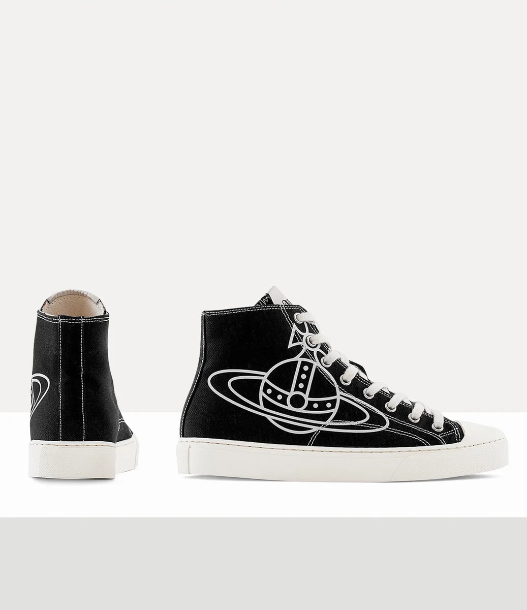 Onze hoge canvas plimsolls zijn voorzien van het archiefmotief ‘Line Orb’ van het huis, dat synoniem staat voor Vivienne’s visie om traditie naar de toekomst te brengen. Het model heeft een katoenen canvas afwerking en is versierd met een geweven label op de tong.