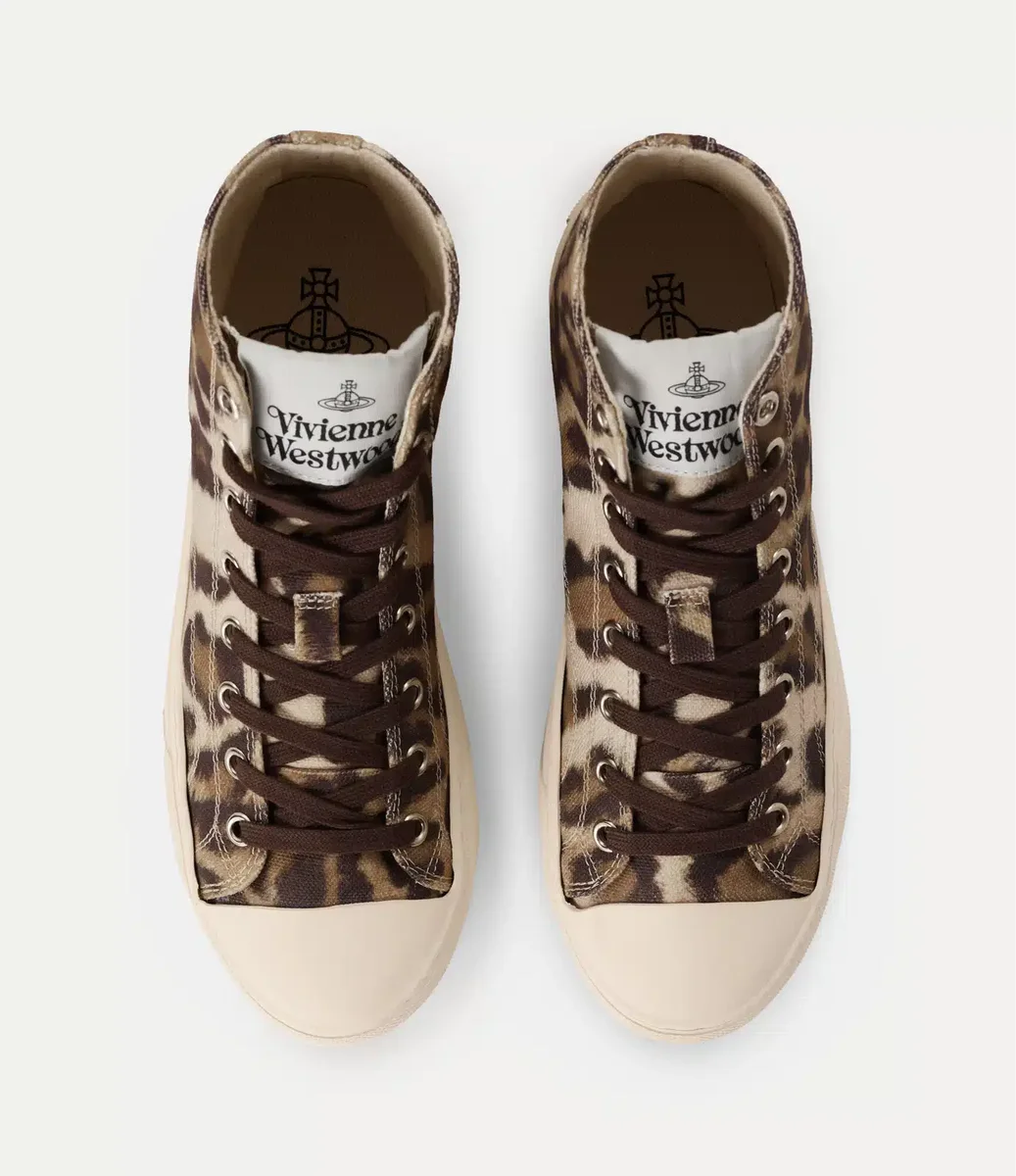 De hoge plimsoll van Vivienne Westwood is dit seizoen opnieuw ontworpen in bedrukt katoenen canvas.