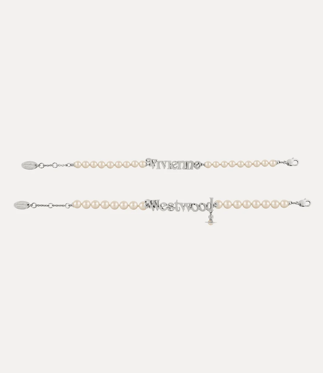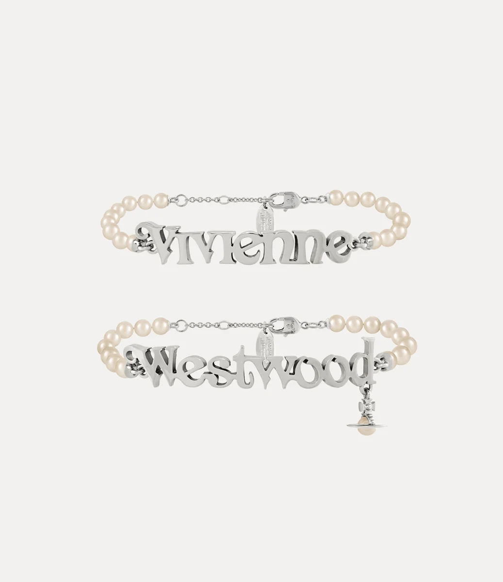 De Amelia-armband is voorzien van de woorden ‘Vivienne’ en ‘Westwood’ in het kenmerkende lettertype van het huis, afgewerkt met een zilverkleurige plating. Het ontwerp heeft een streng glazen parels, compleet met een hangend bolvormig bedeltje aan de sluiting – een weerspiegeling van het ethos om het verleden naar de toekomst te brengen.