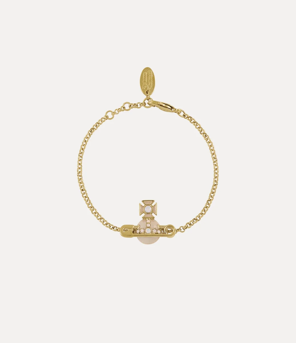 Onze Kitty-armband is dit seizoen opnieuw ontworpen met een gepolijste goudkleurige plating en klassieke hardware-details. Het centrale bolmotief is geaccentueerd met handgeschilderd doorschijnend email en doorboord met een klassiek veiligheidsspeldmotief, een knipoog naar Vivienne’s kenmerkende punkesthetiek.
