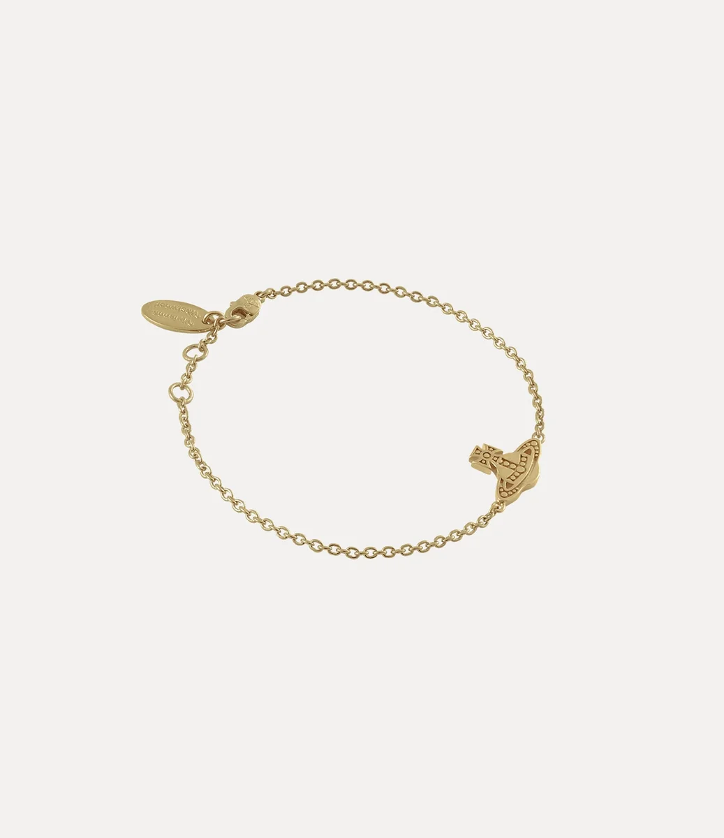 Onze Marinetta-armband is gemaakt van goudkleurig metaal en heeft in het midden het kenmerkende bolmotief van het huis. Het ontwerp heeft een zacht gedrukte, kralenachtige textuur die een handgemaakt uiterlijk geeft, terwijl gegraveerde details de contouren van de kruisvormige bovenkant en de Saturnusring accentueren.